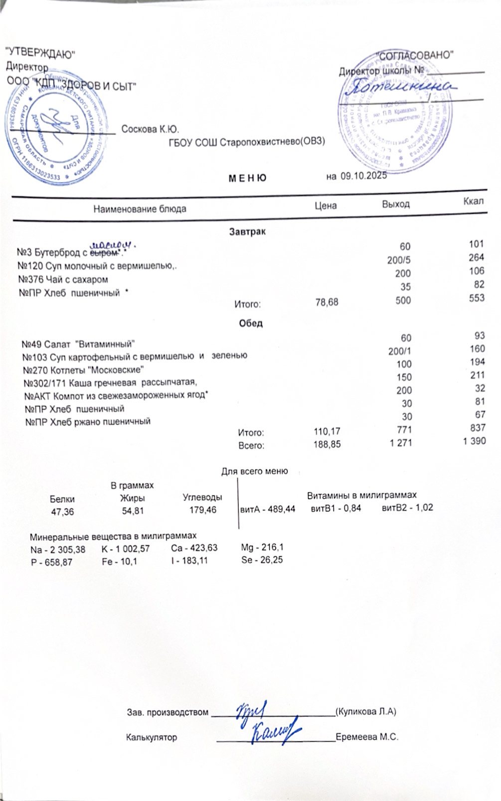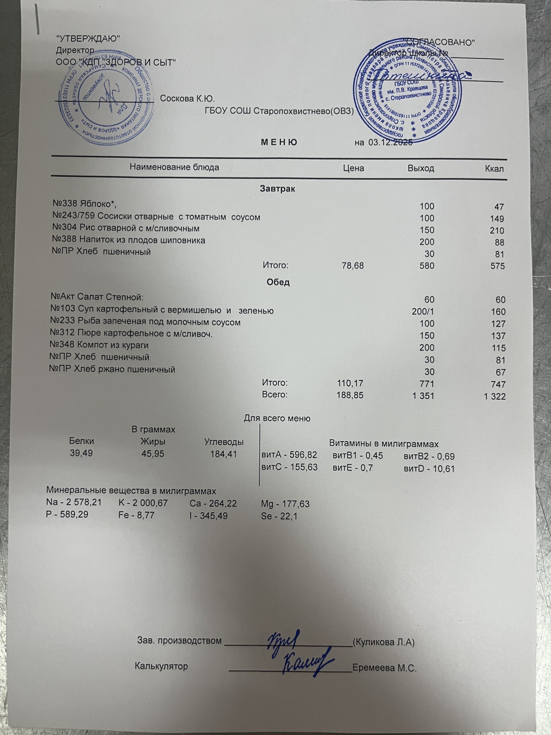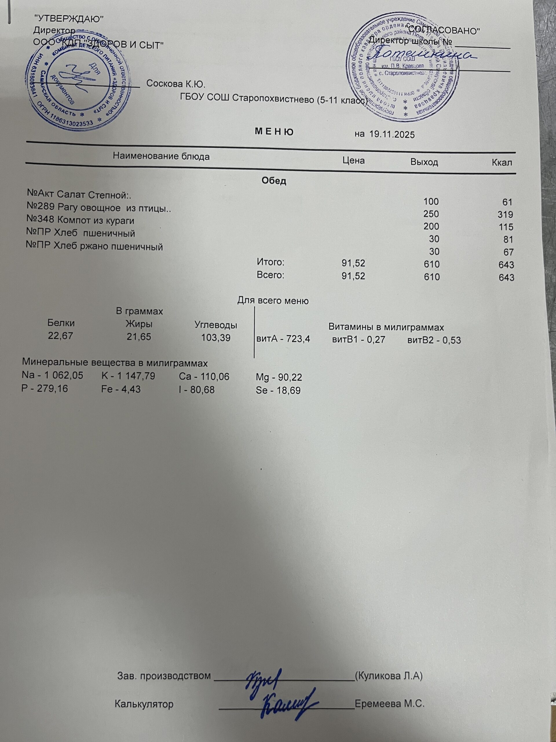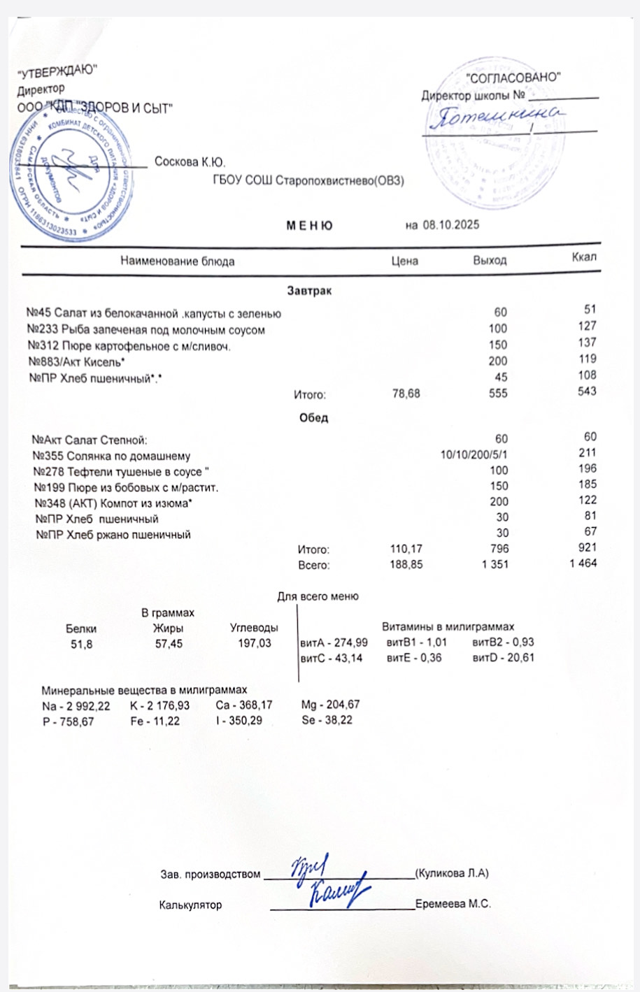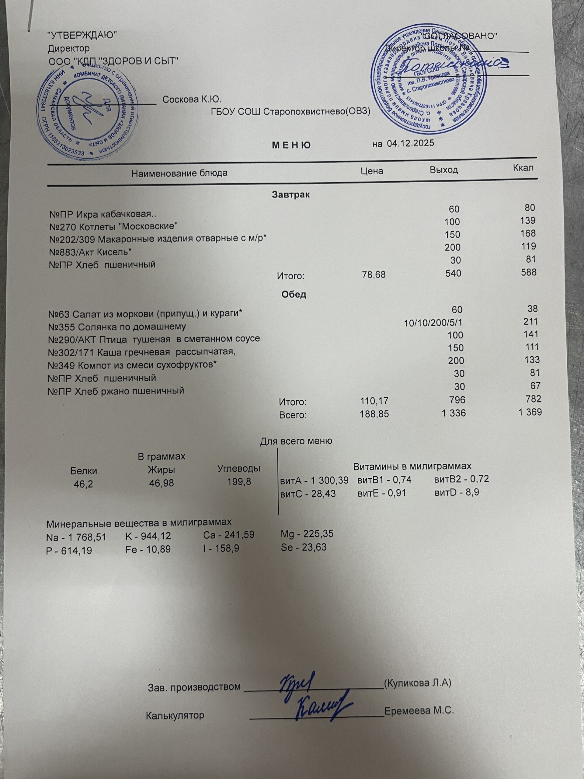 Утвержденное примерное меню (по сезонам в соответствии с возрастной категорией обучающихся)