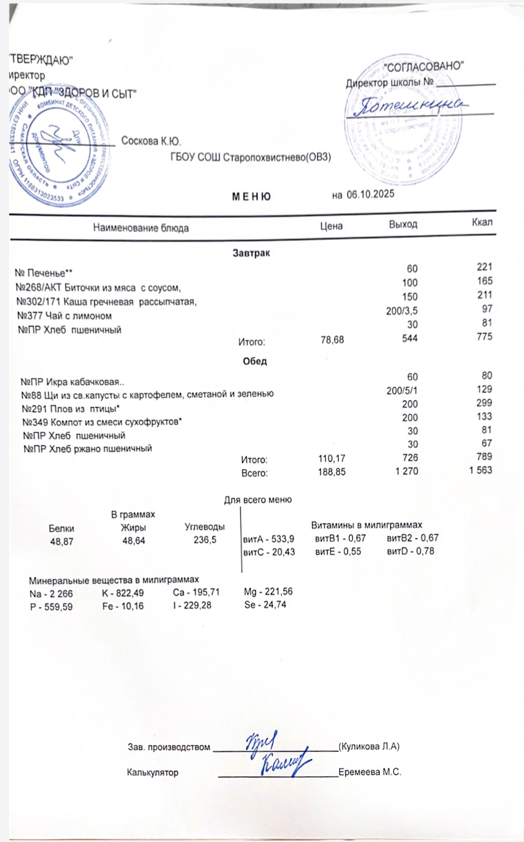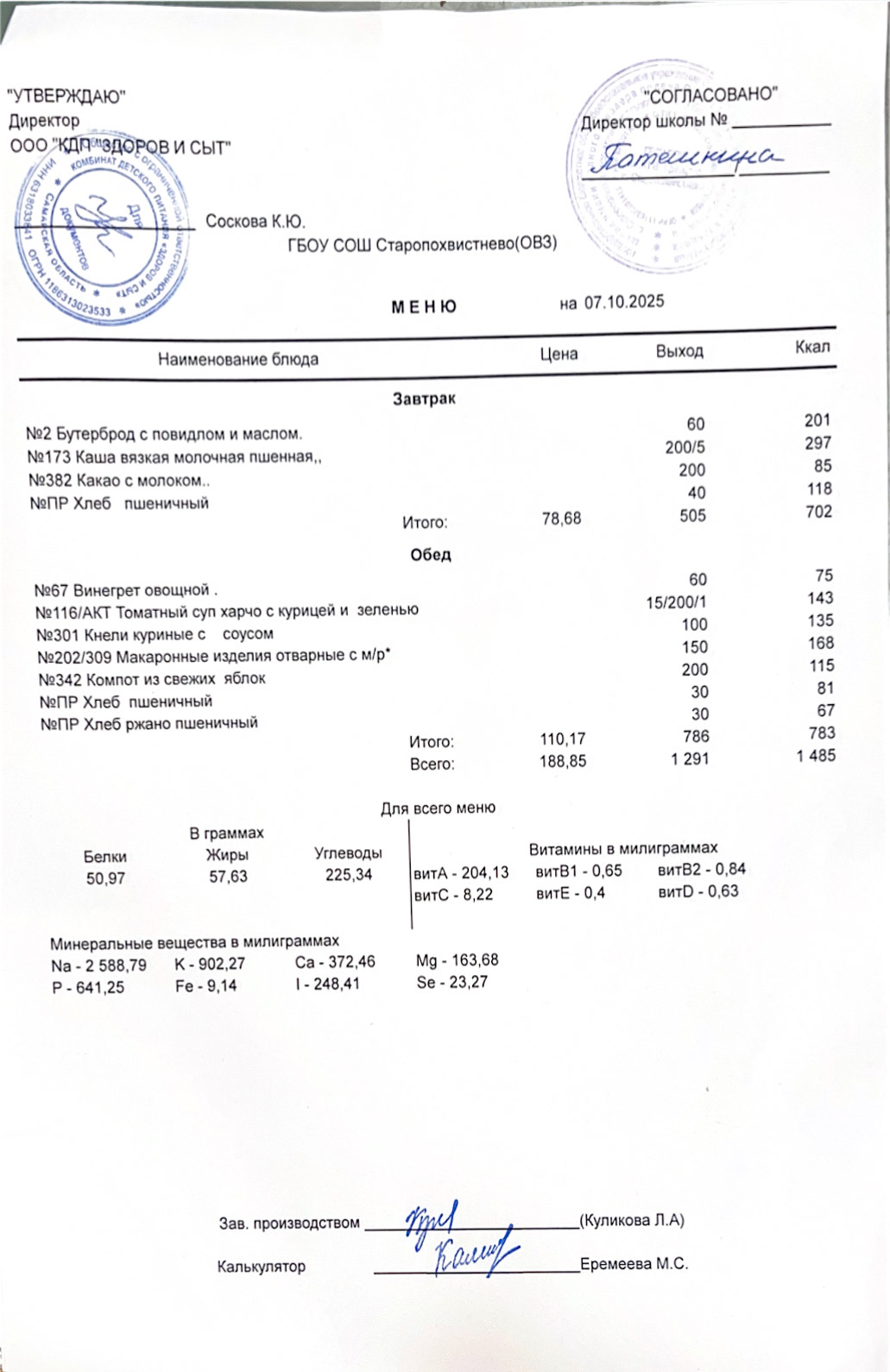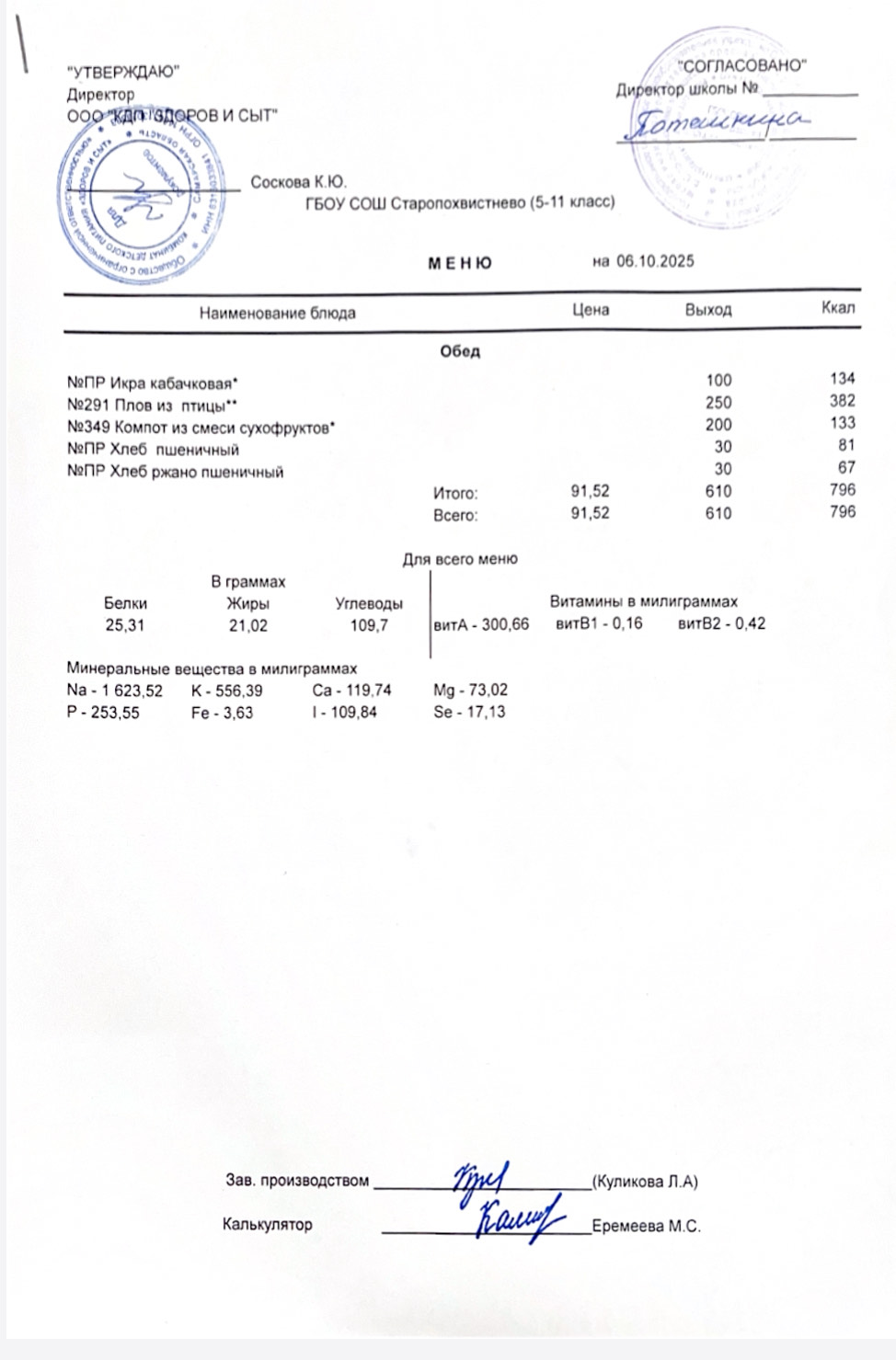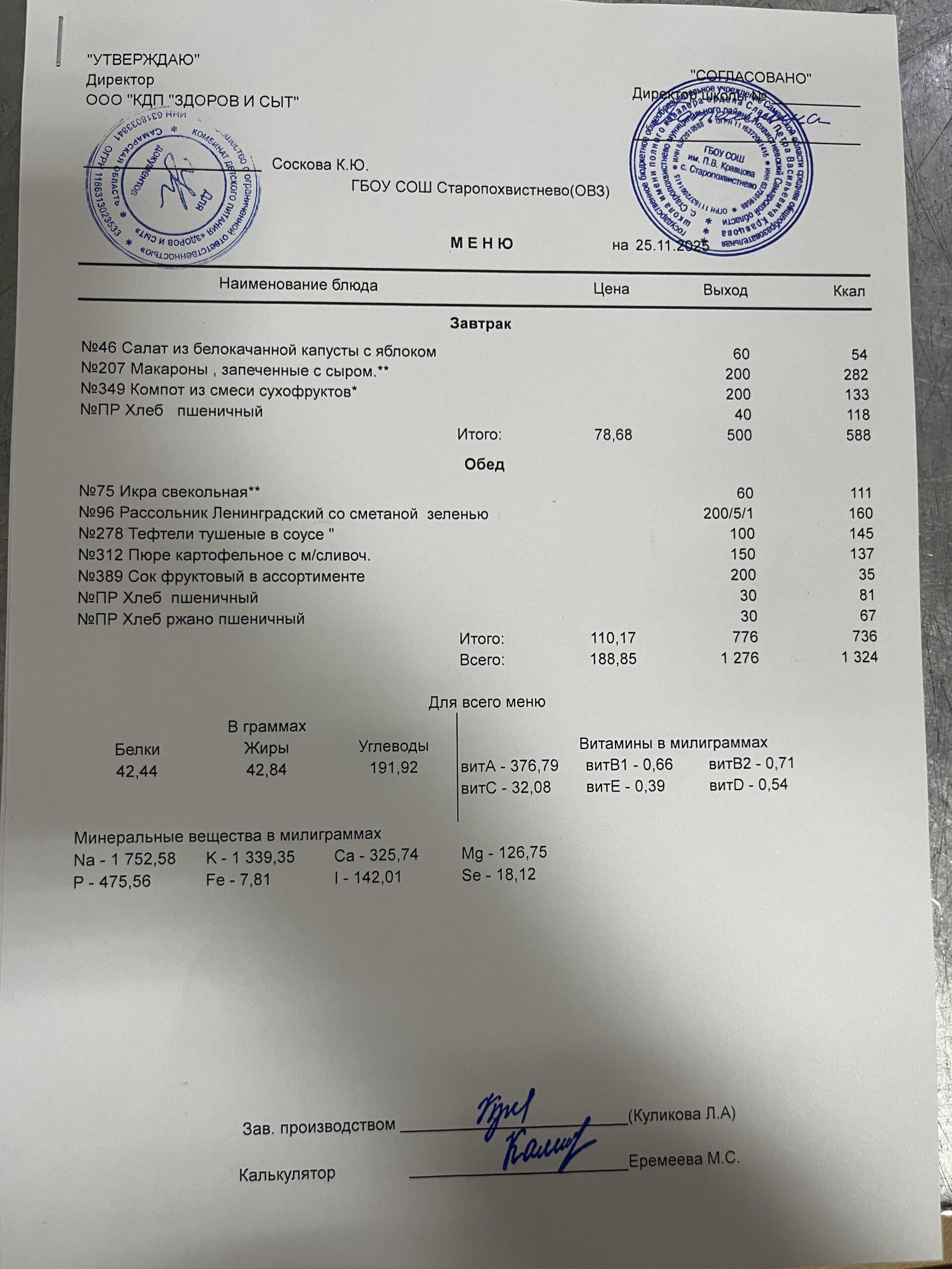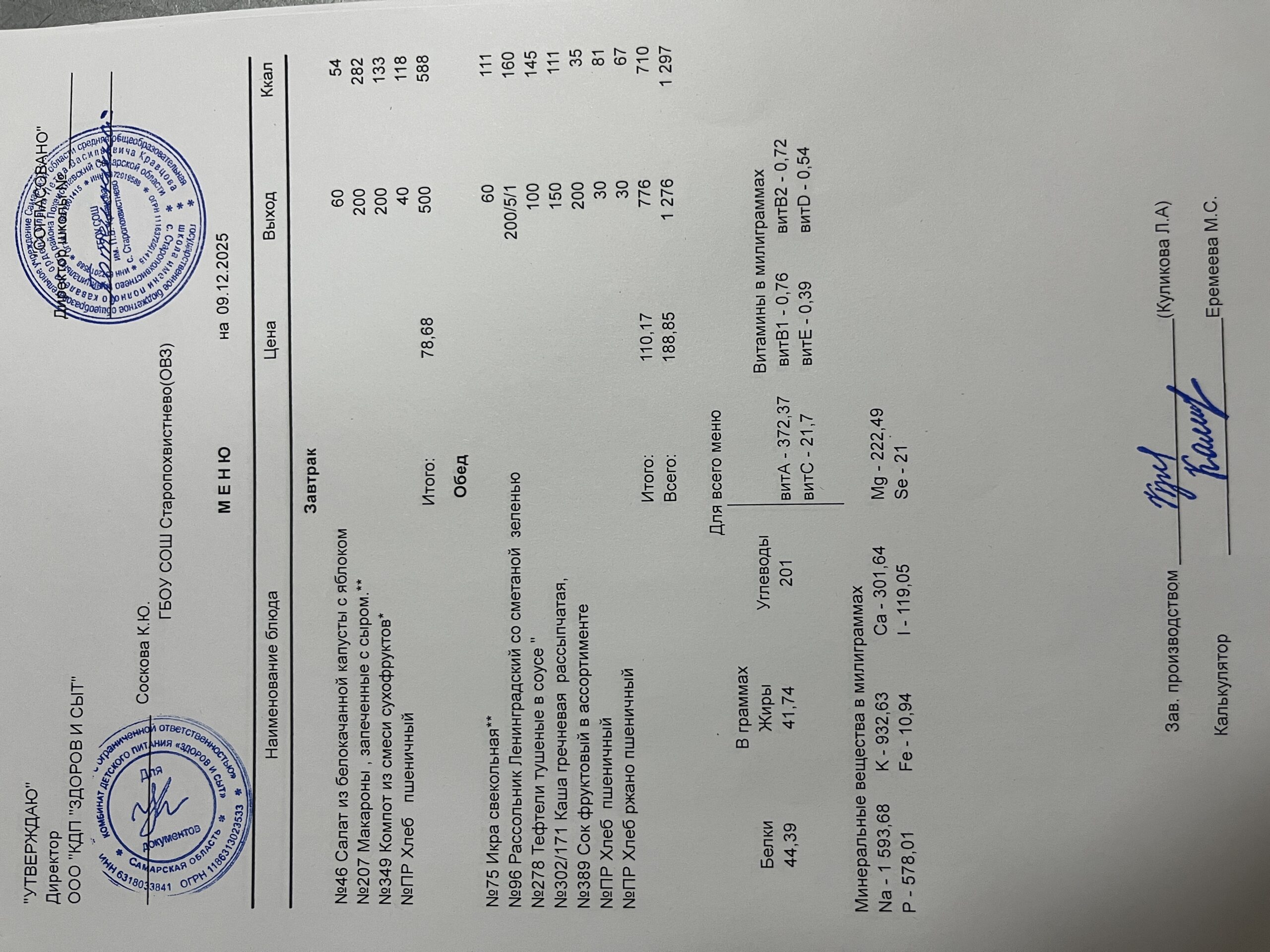 Утвержденное примерное меню (по сезонам в соответствии с возрастной категорией обучающихся)