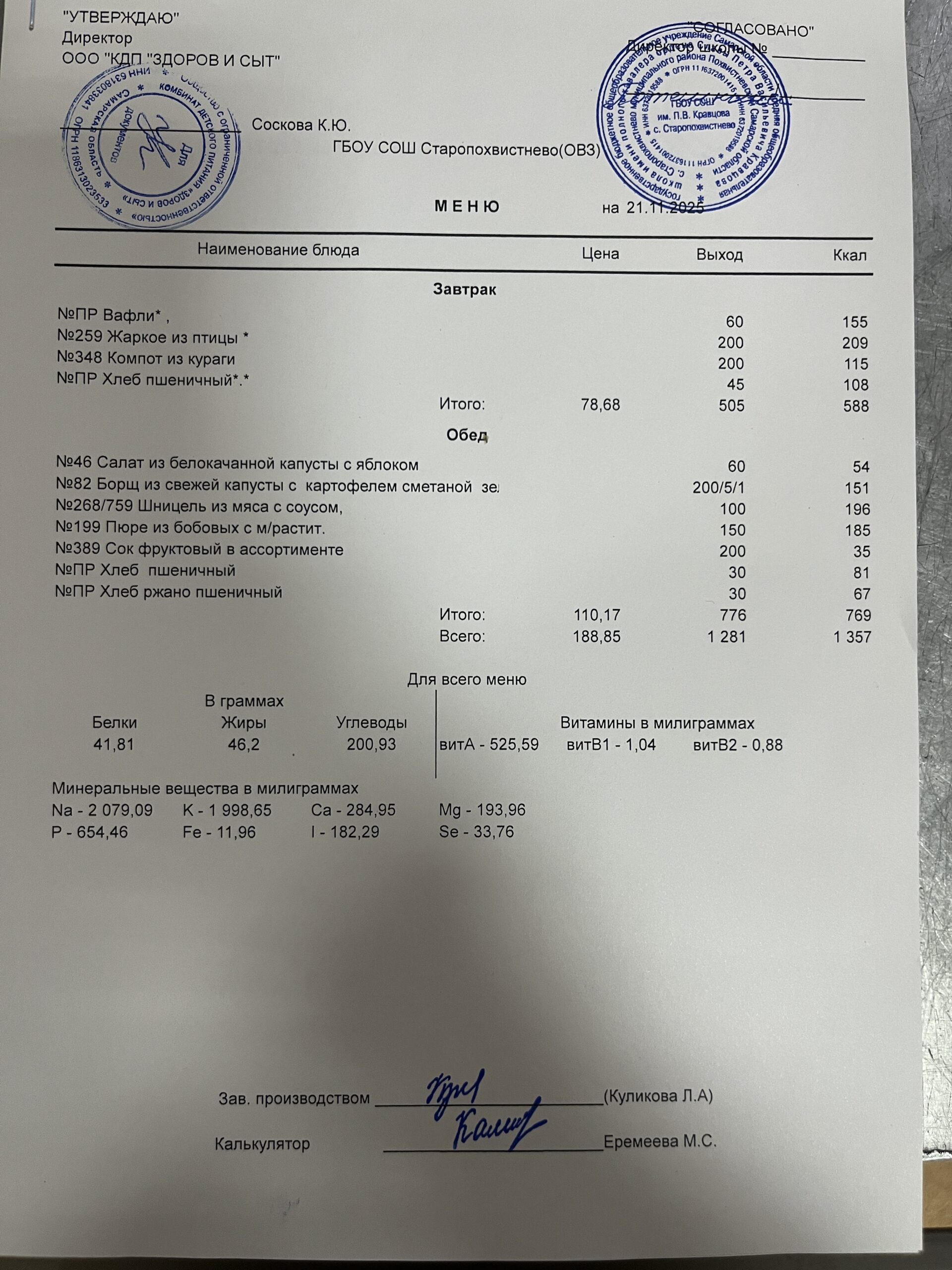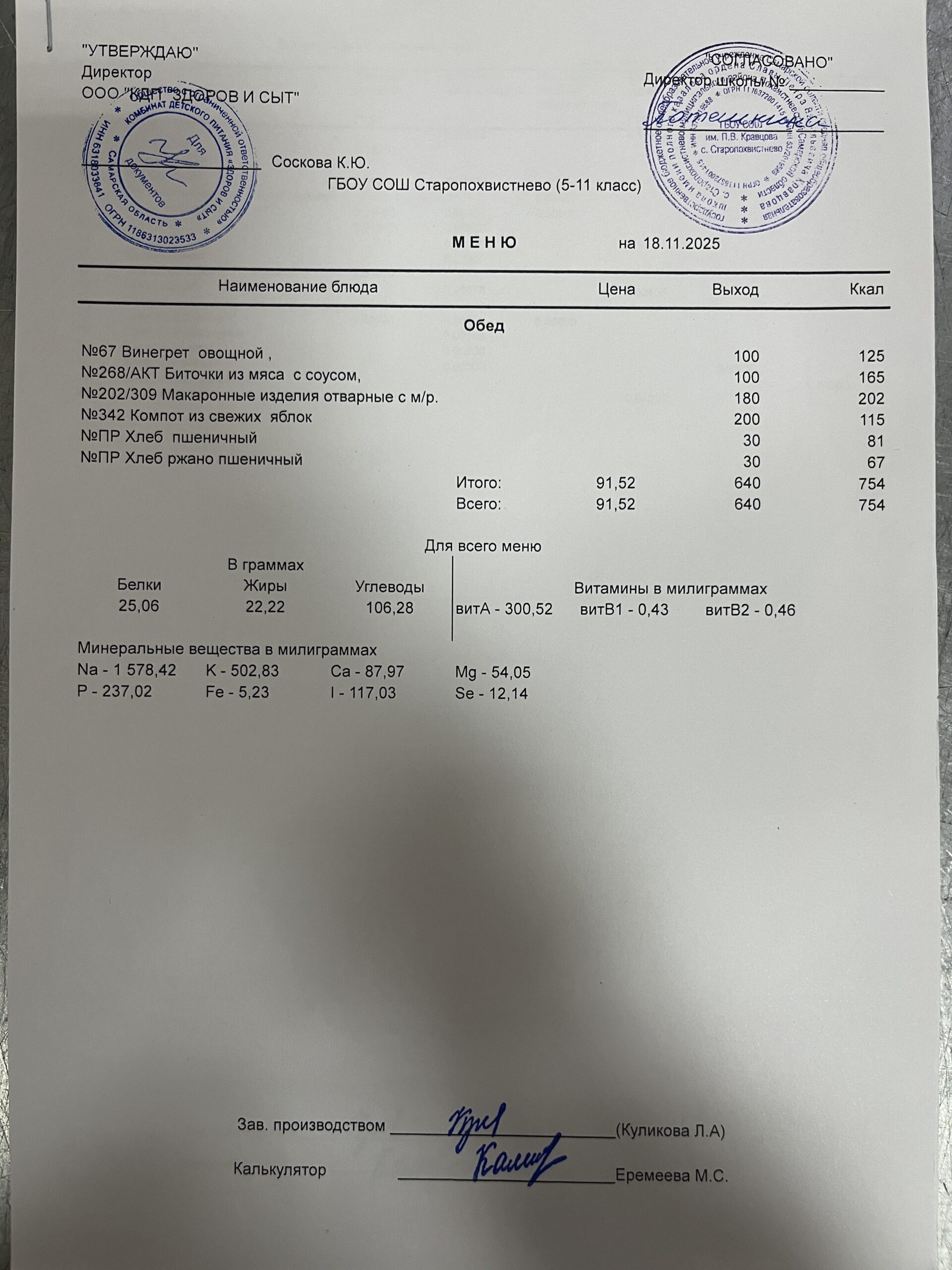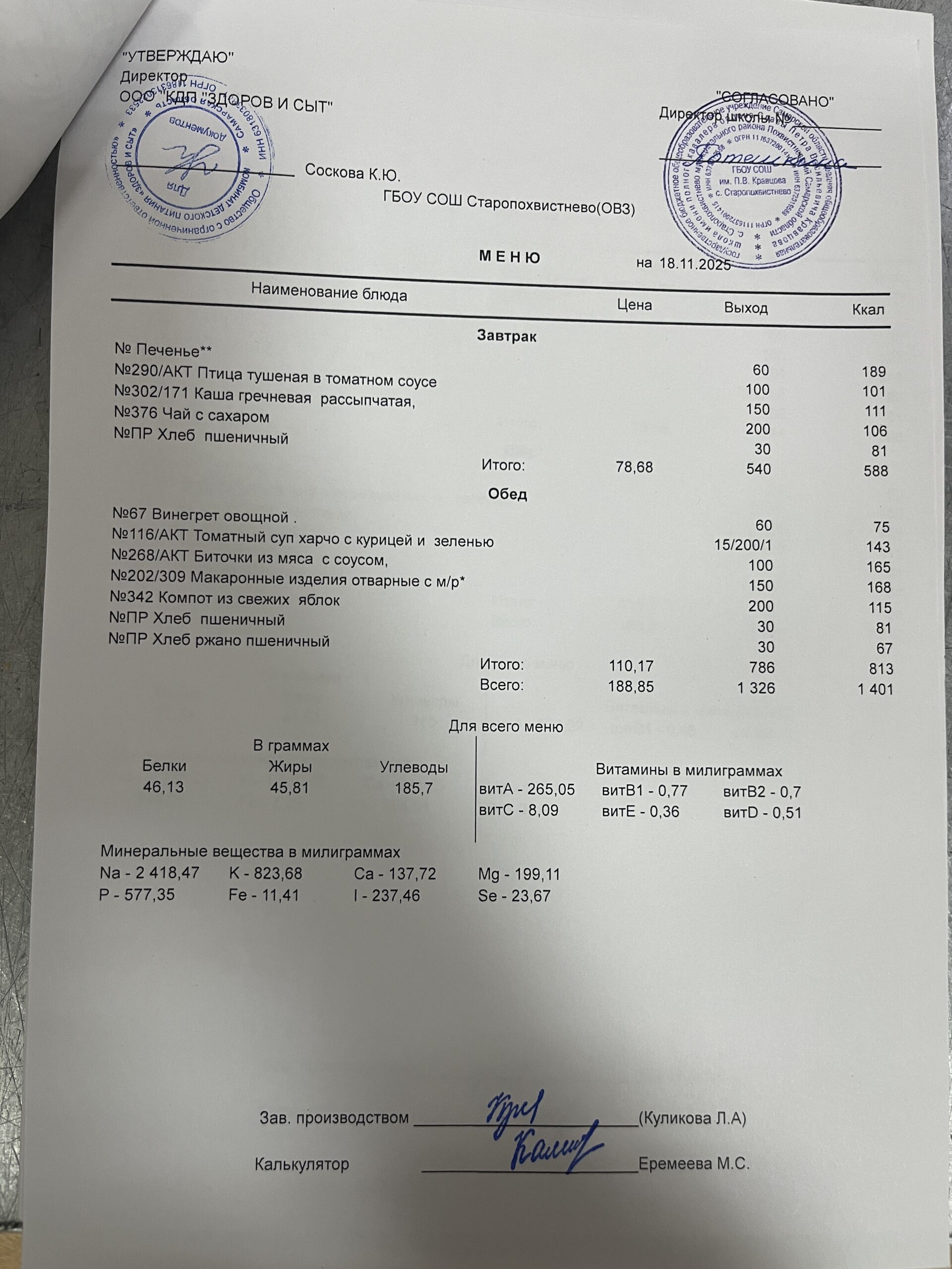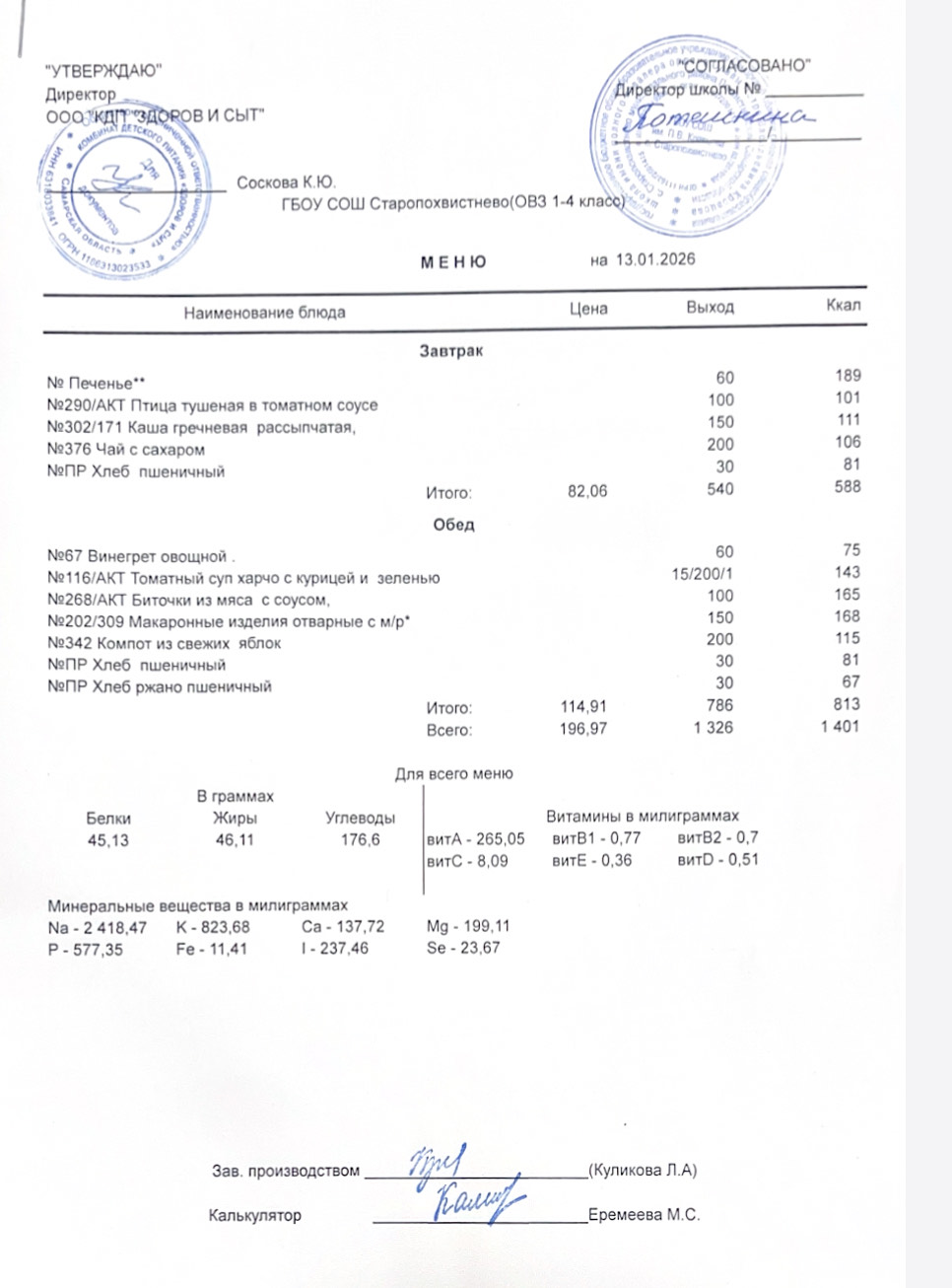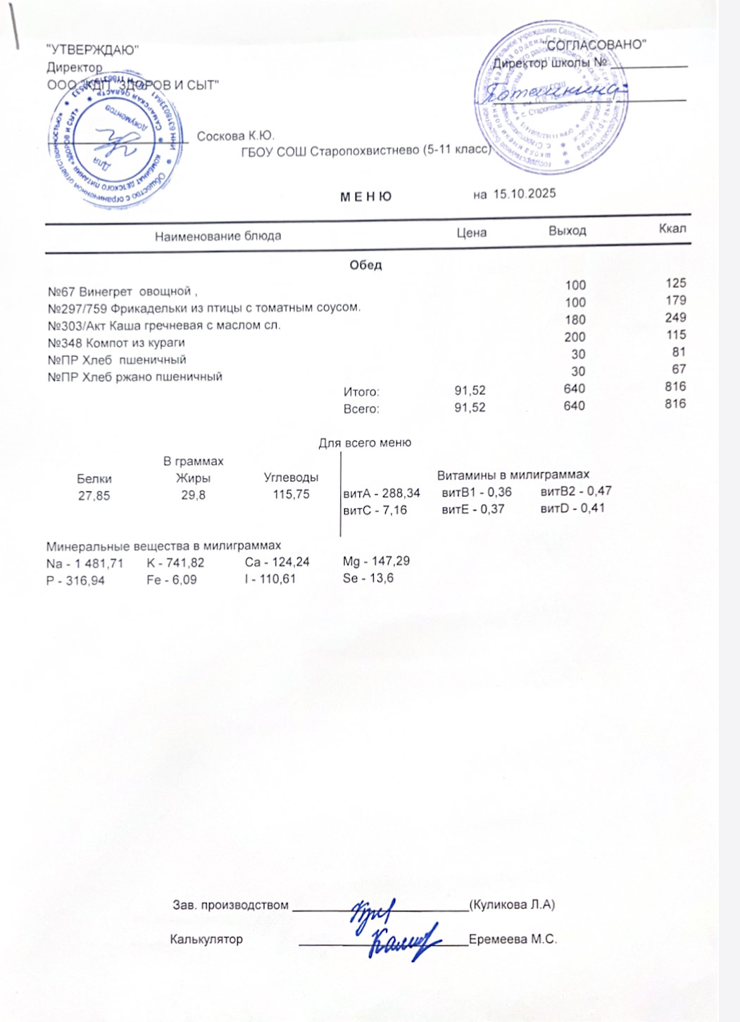 Утвержденное примерное меню (по сезонам в соответствии с возрастной категорией обучающихся)