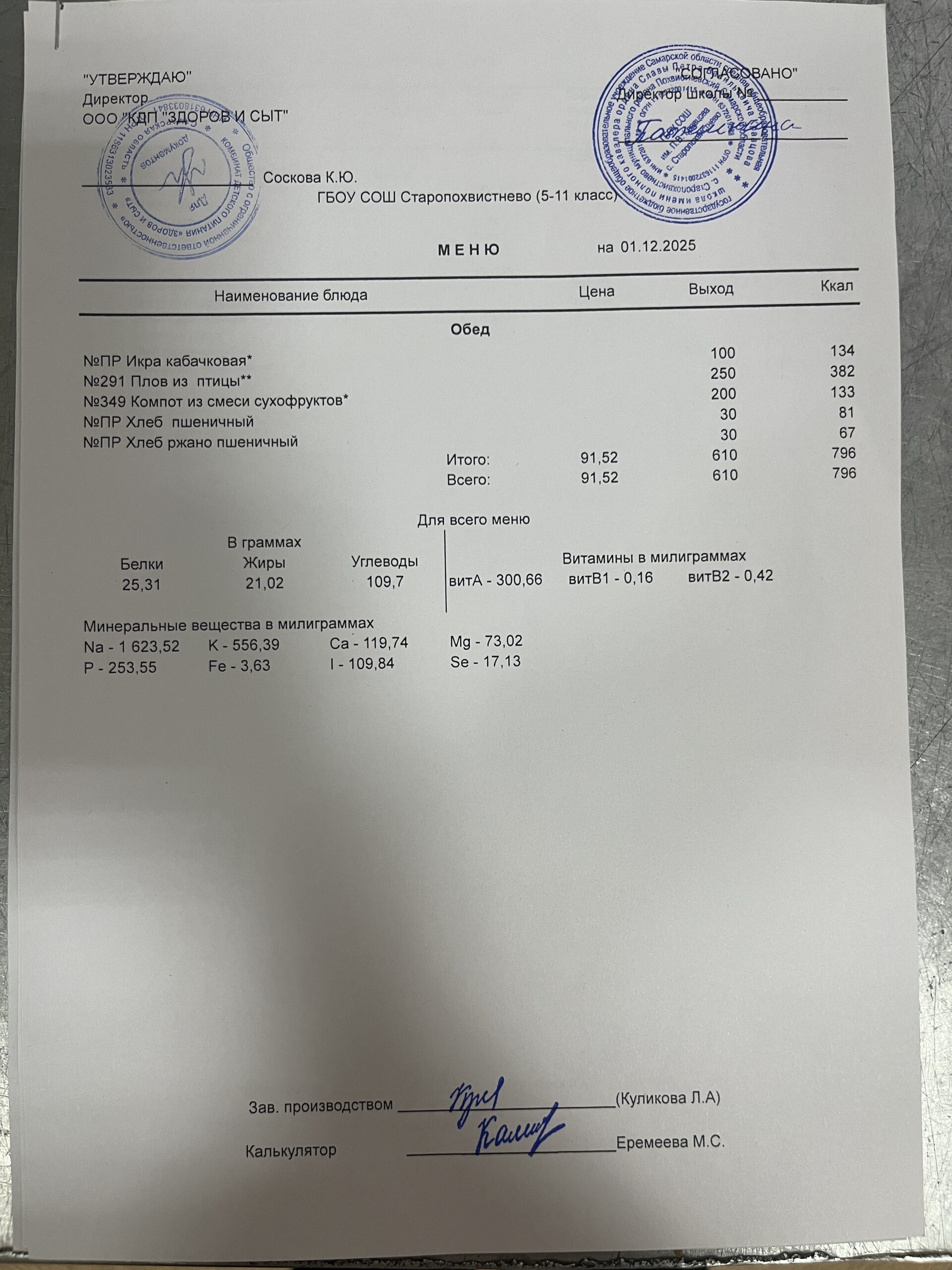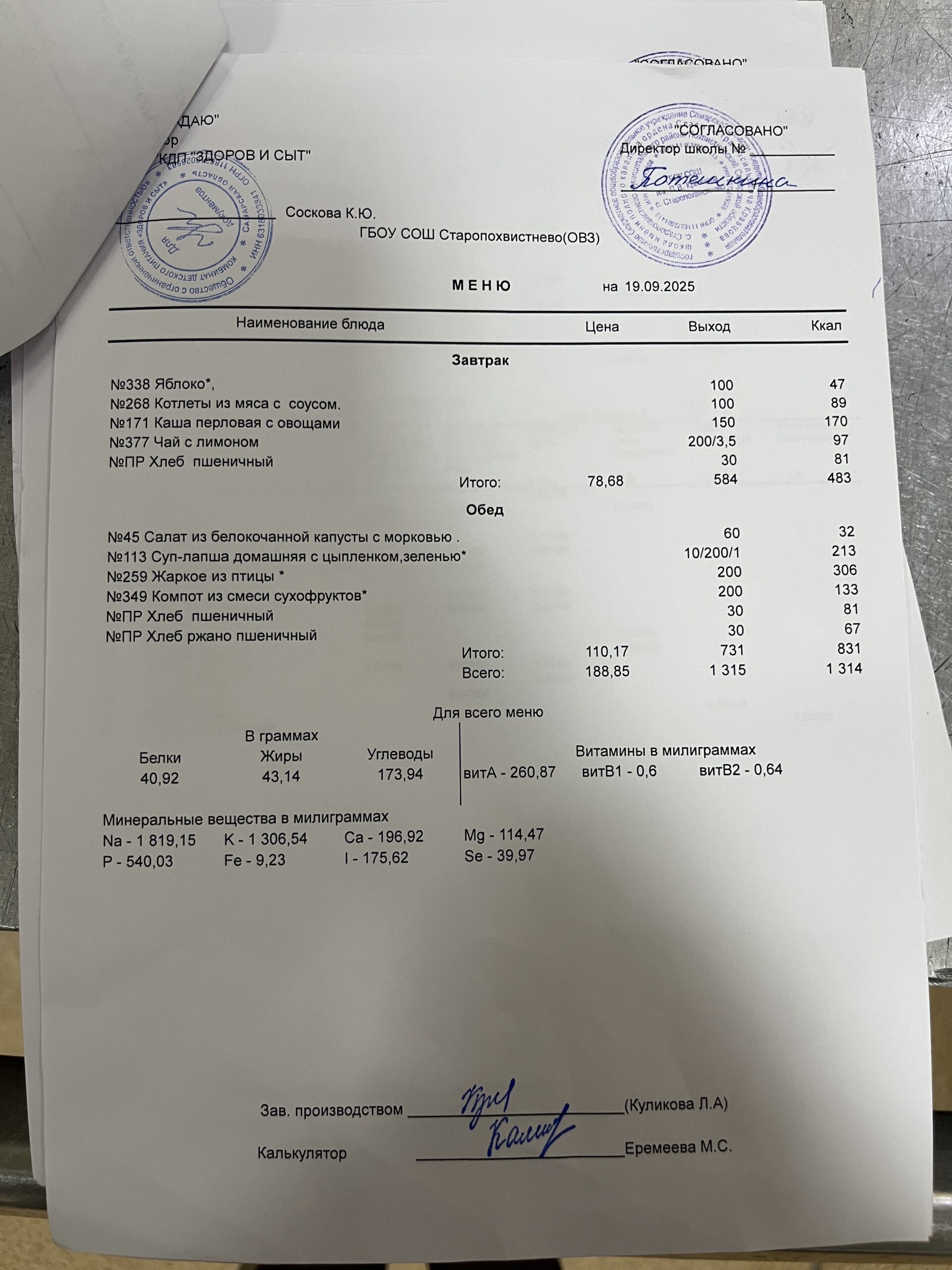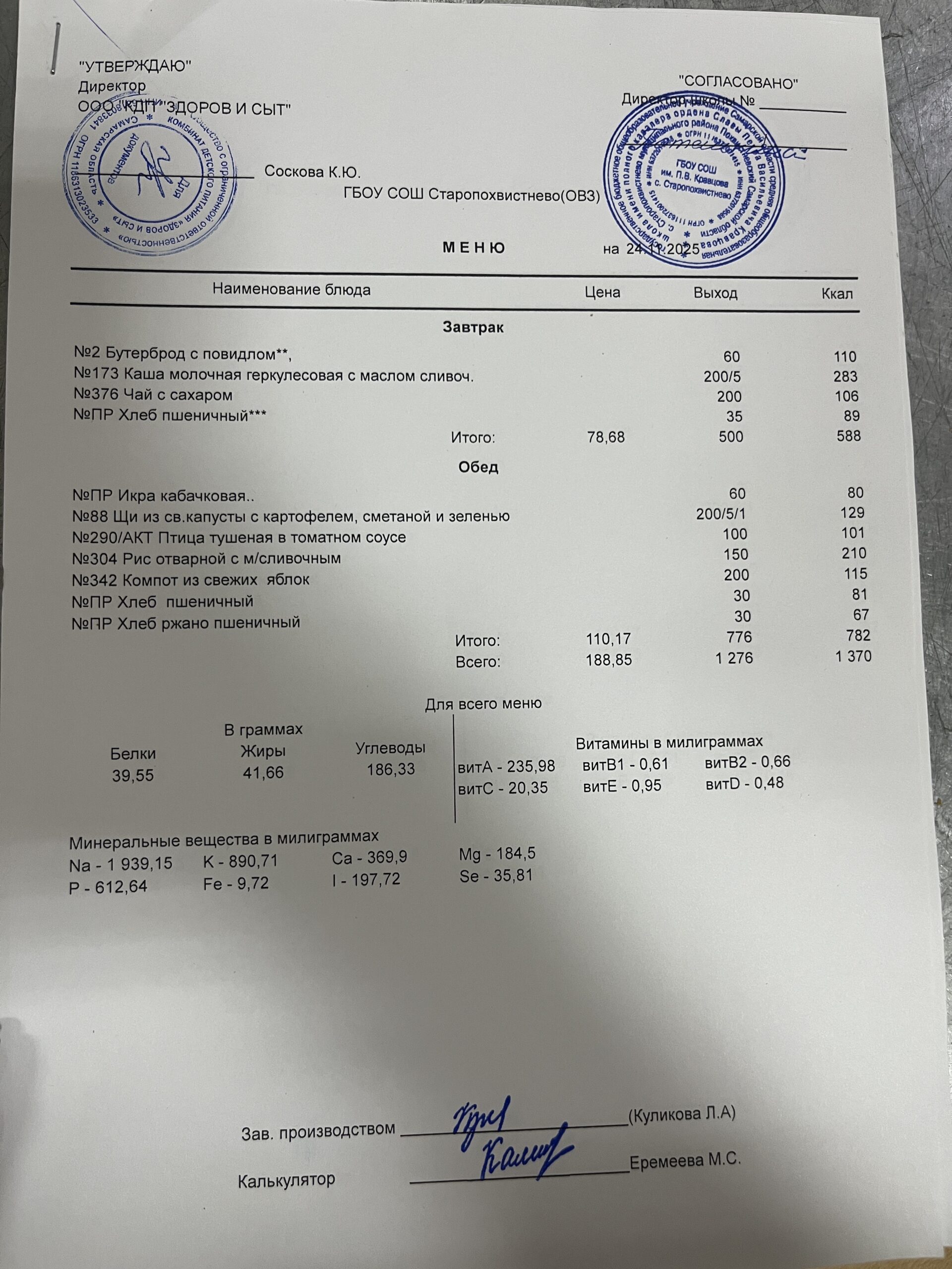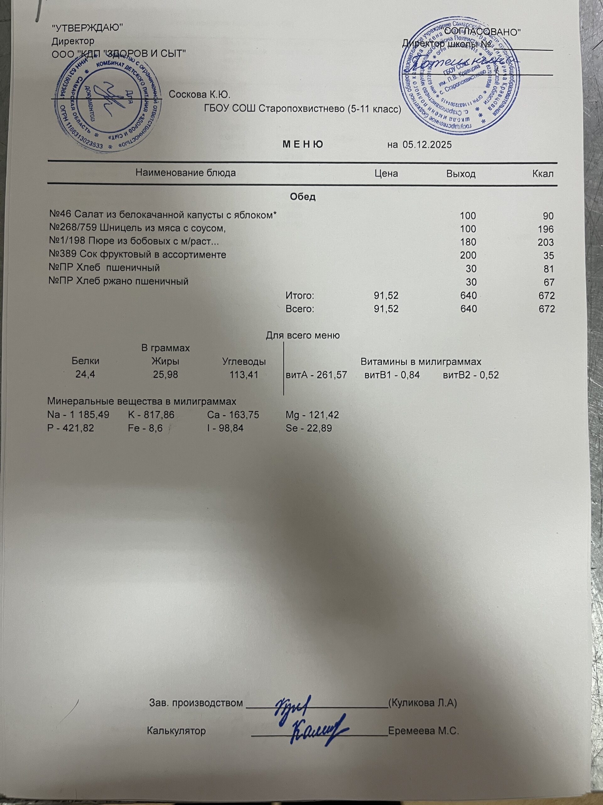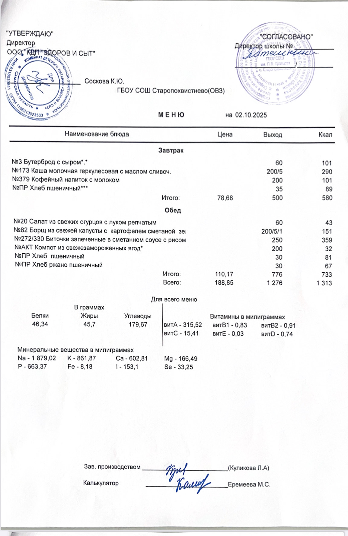 Утвержденное примерное меню (по сезонам в соответствии с возрастной категорией обучающихся)