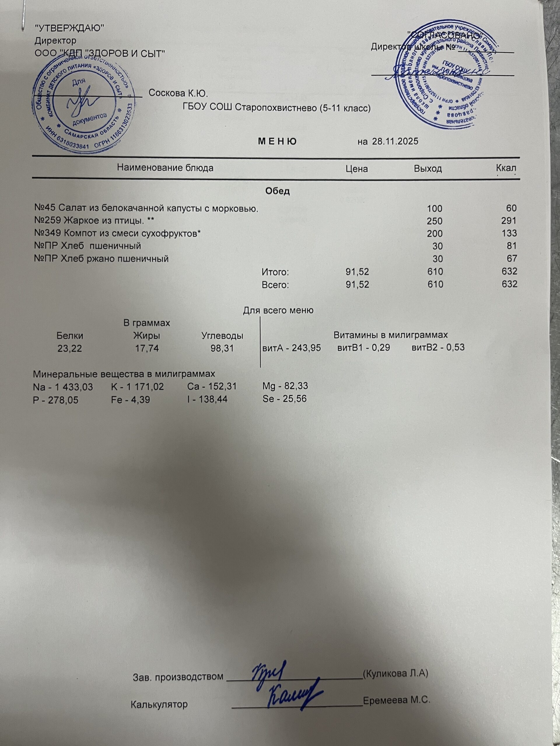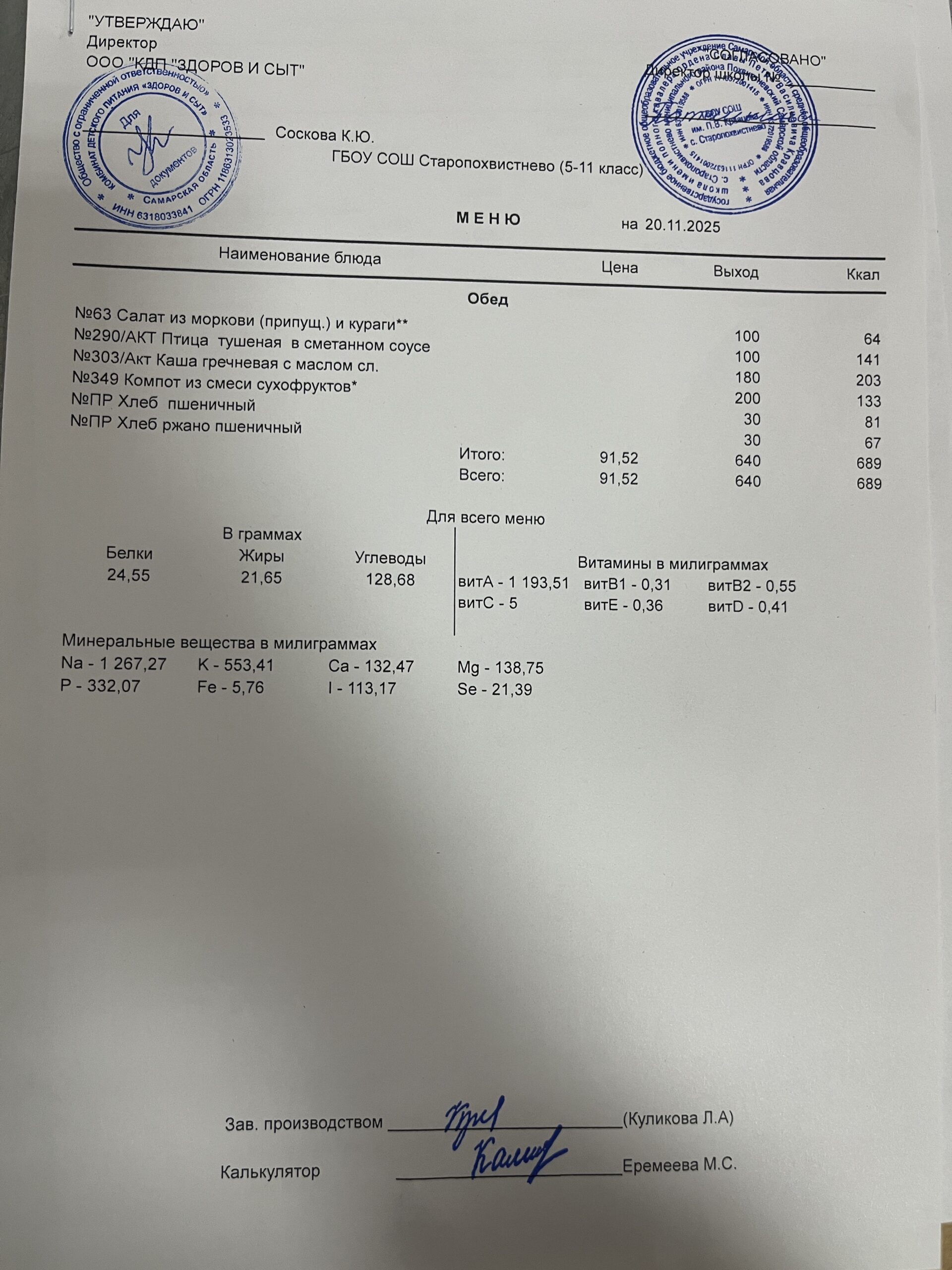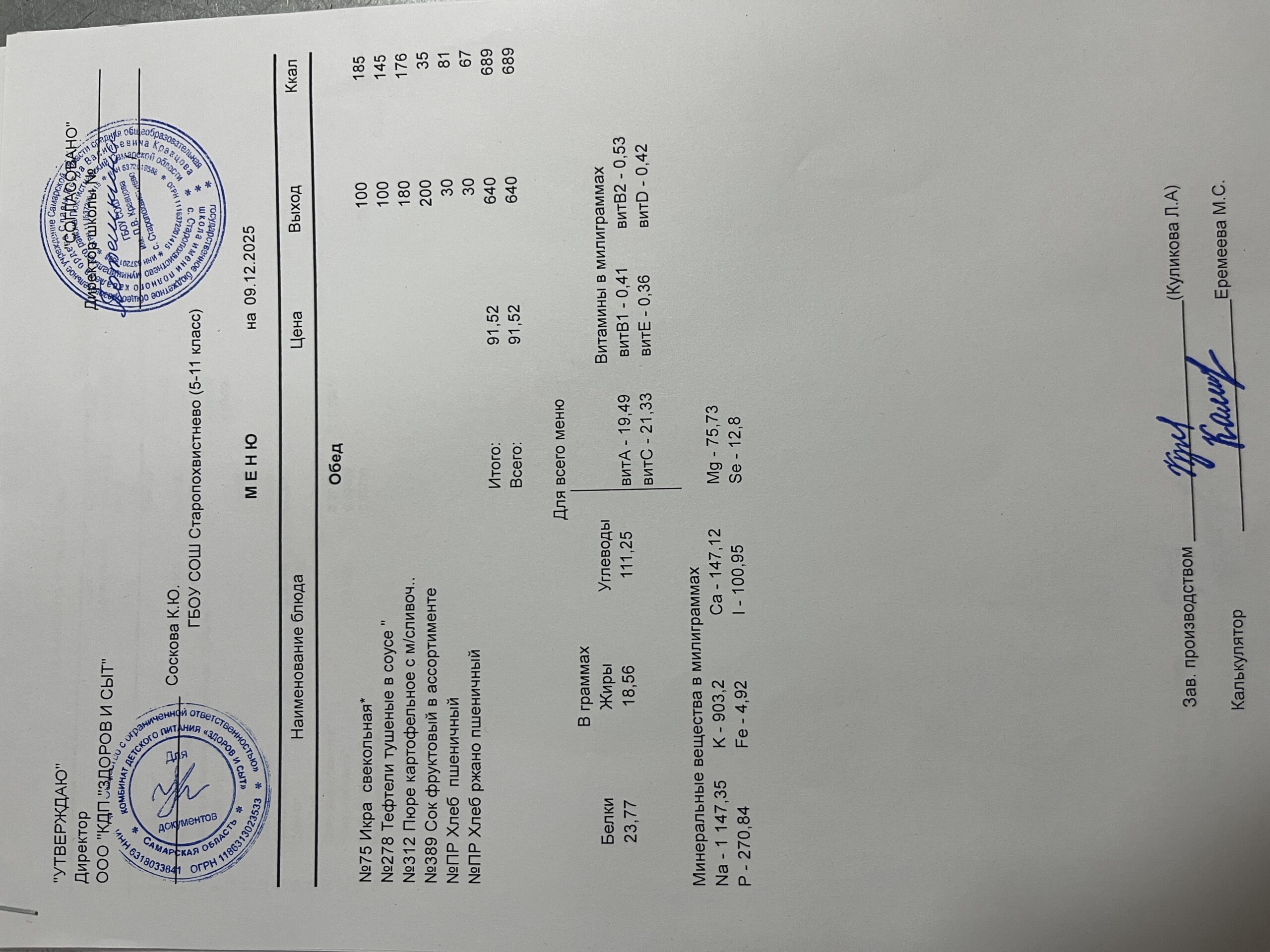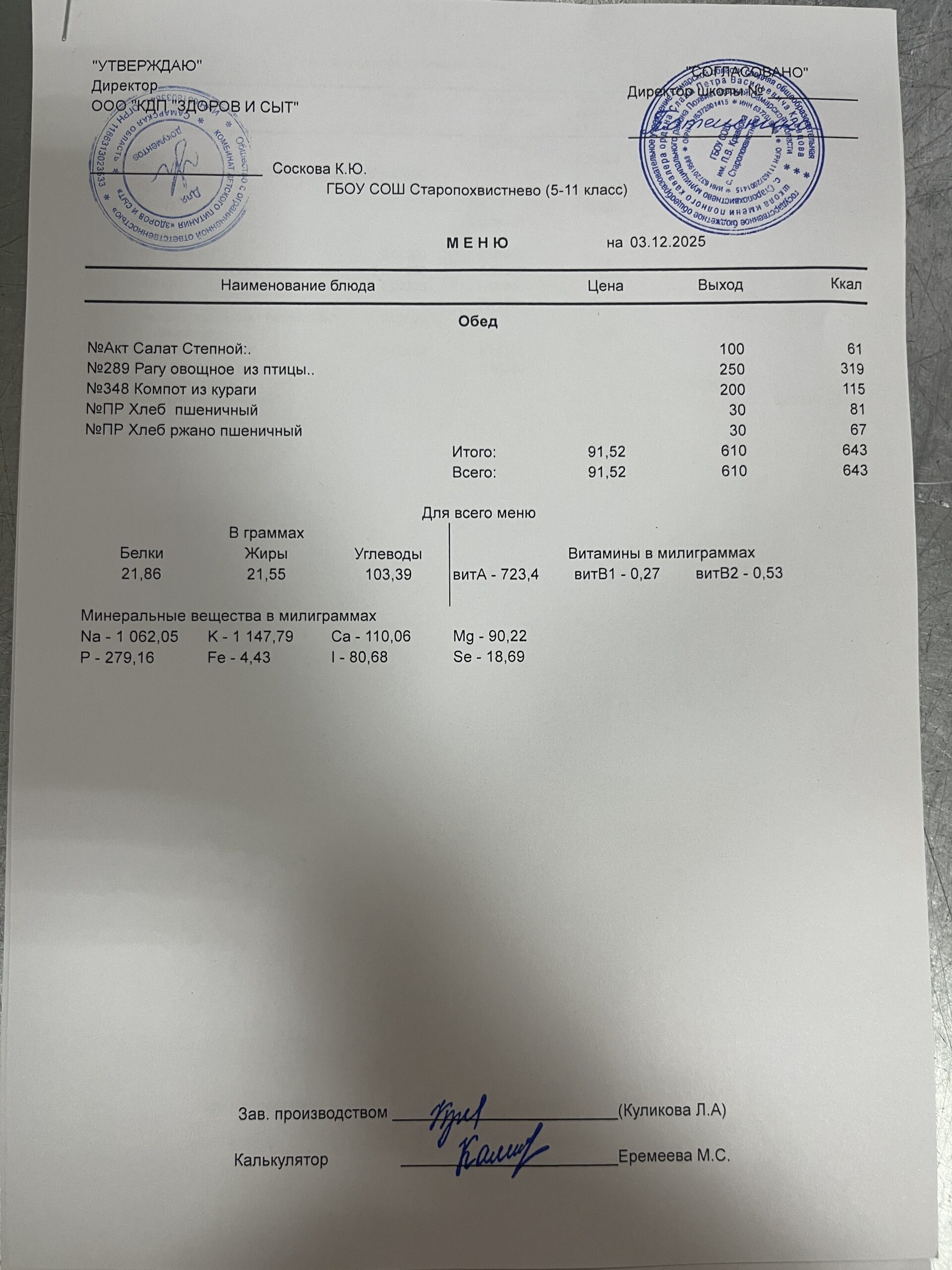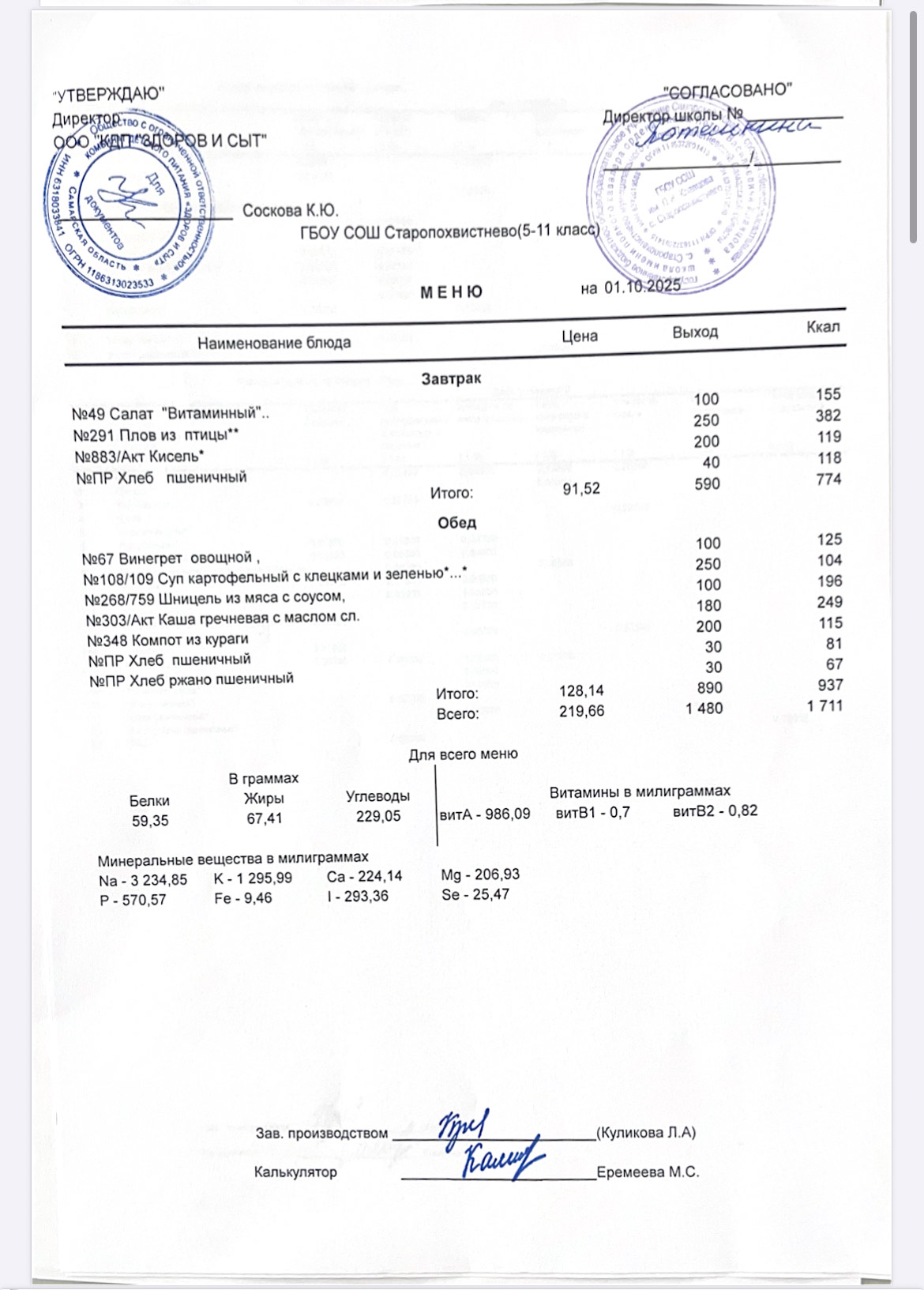 Утвержденное примерное меню (по сезонам в соответствии с возрастной категорией обучающихся)