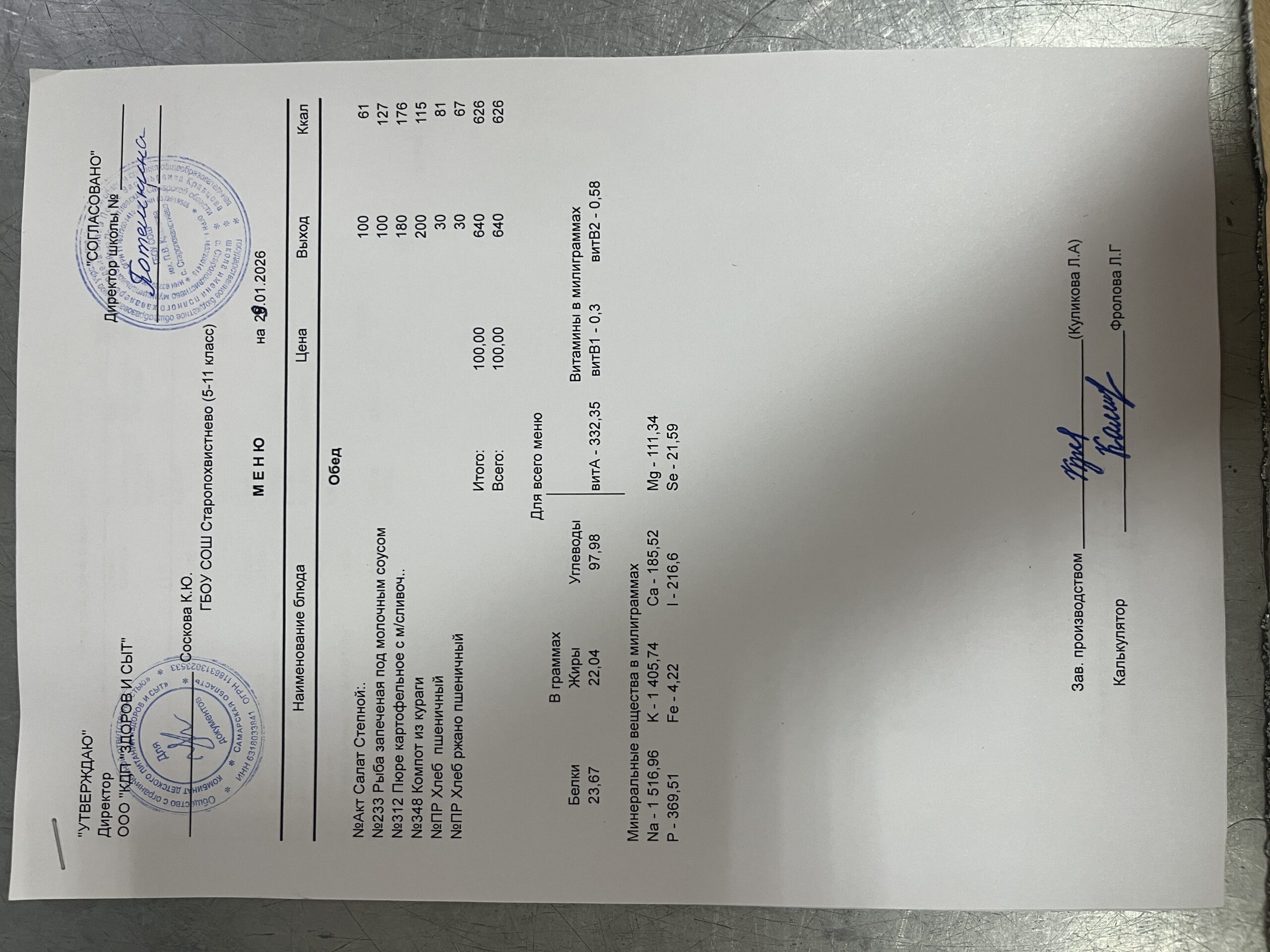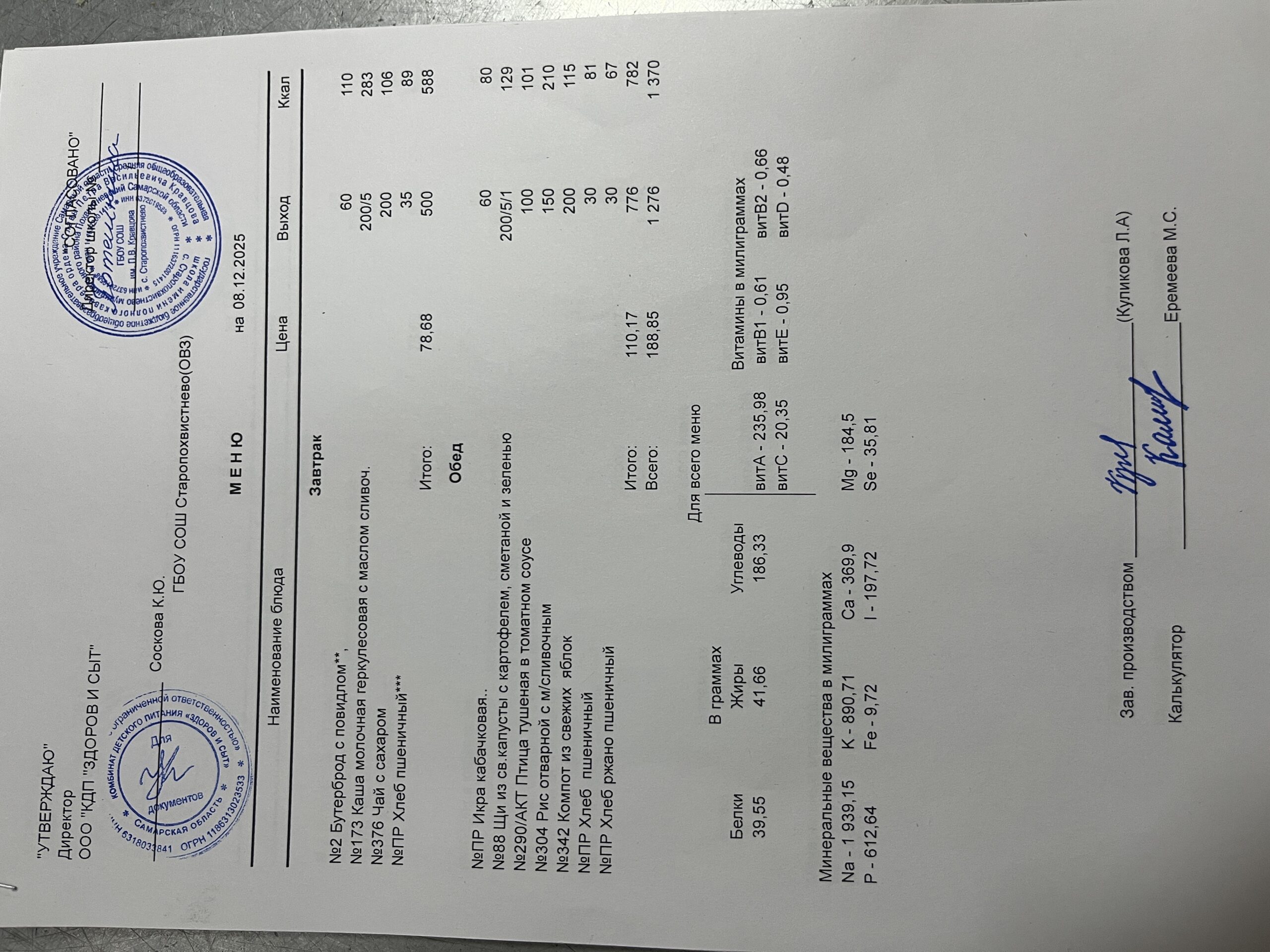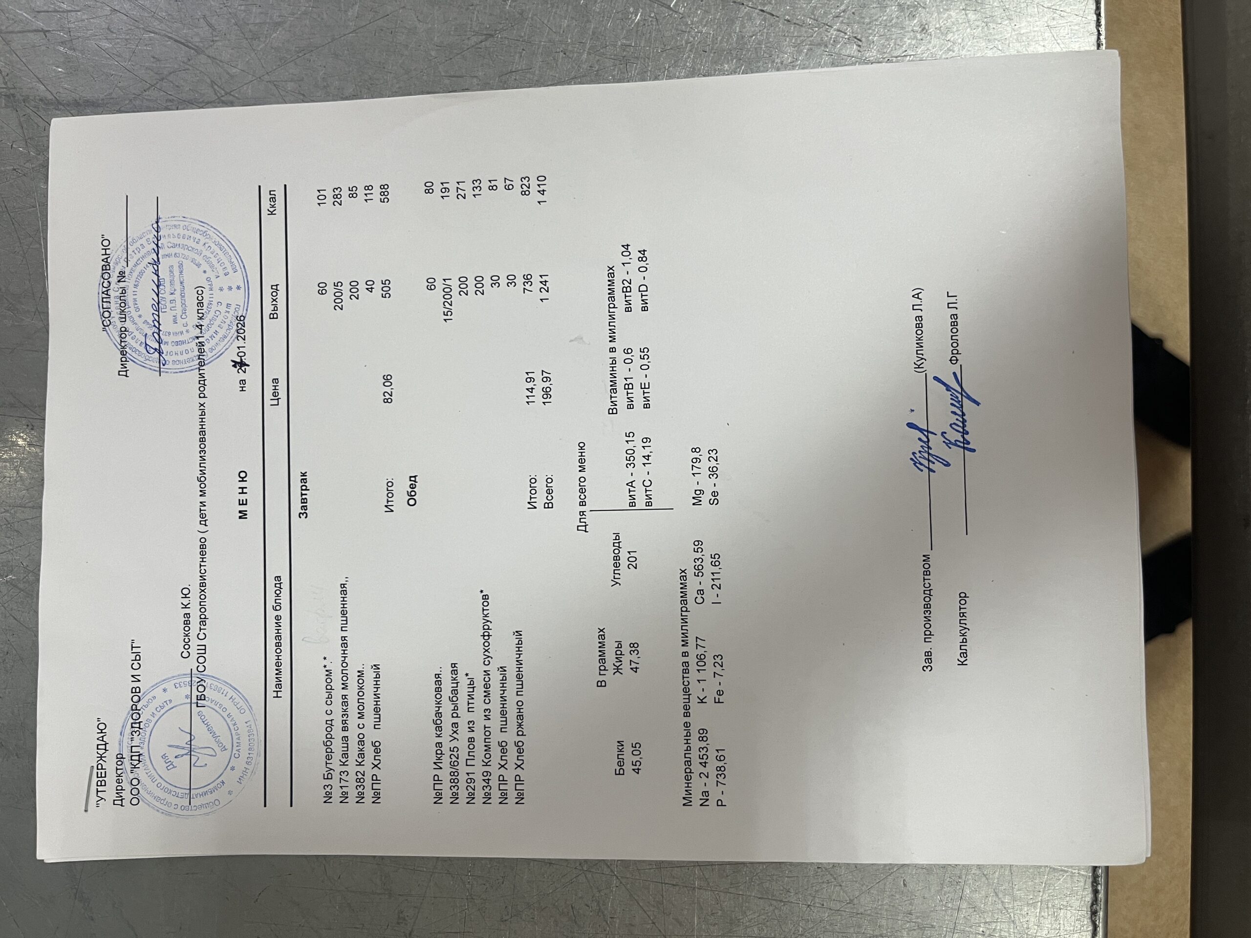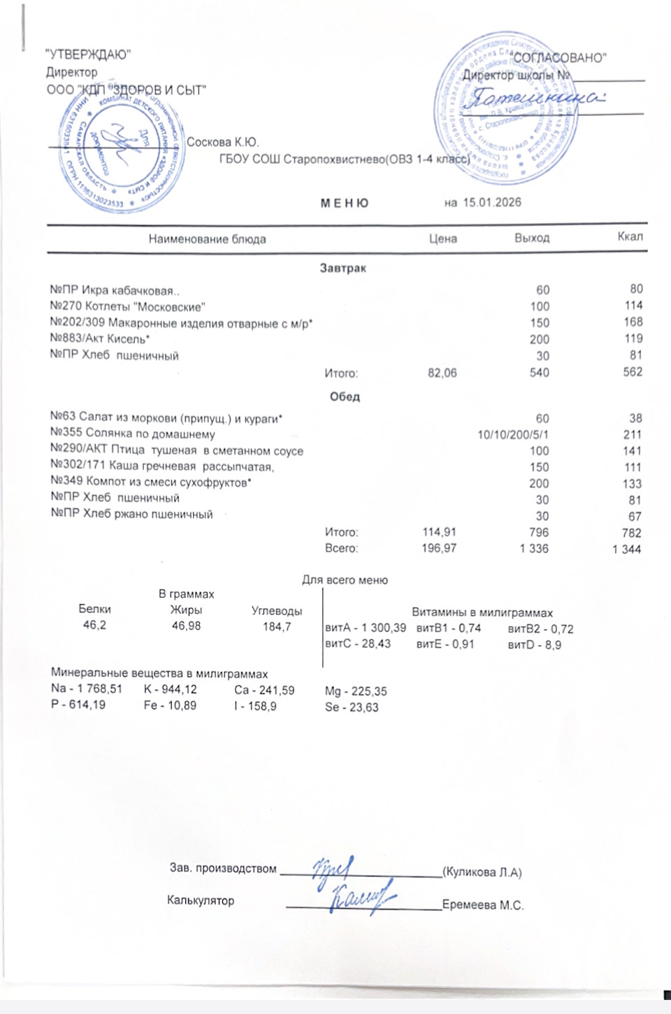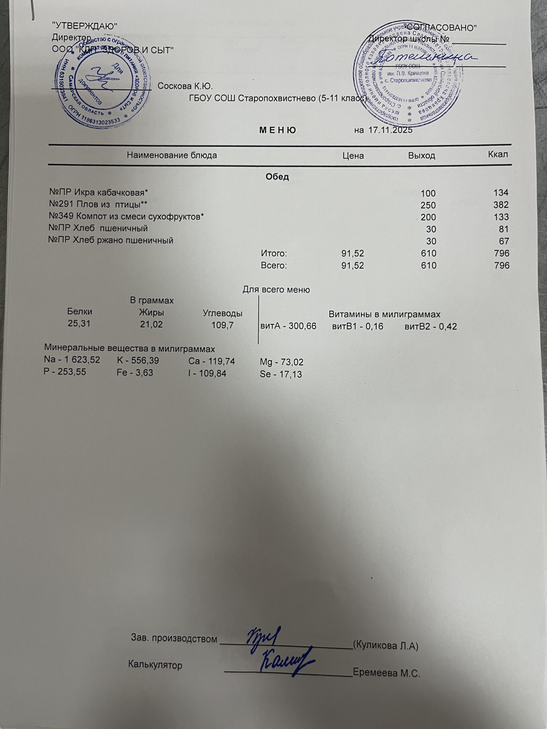 Утвержденное примерное меню (по сезонам в соответствии с возрастной категорией обучающихся)