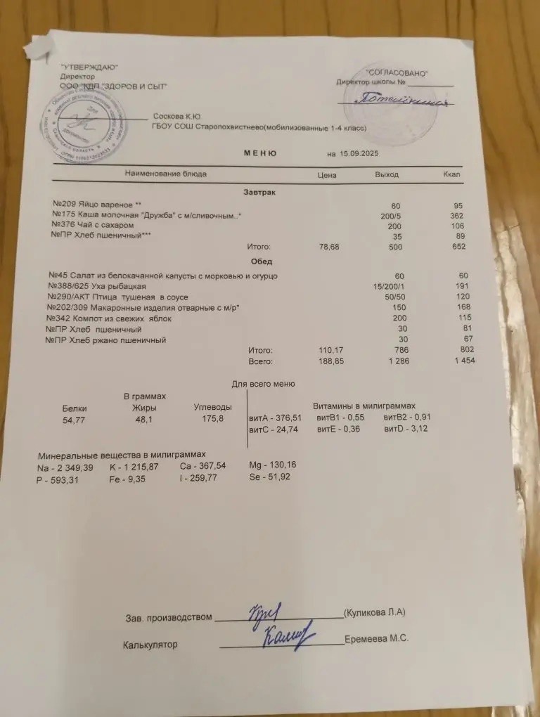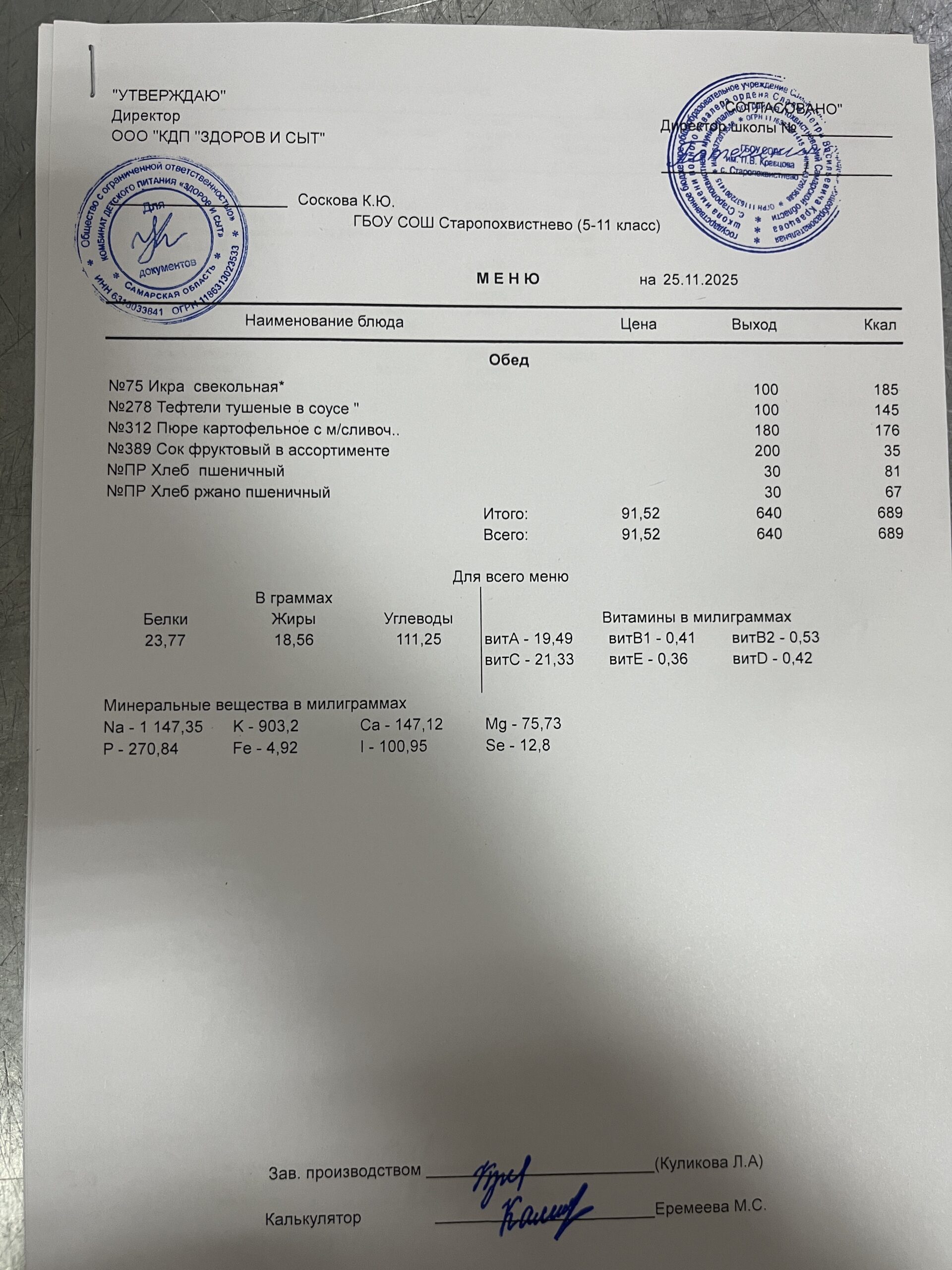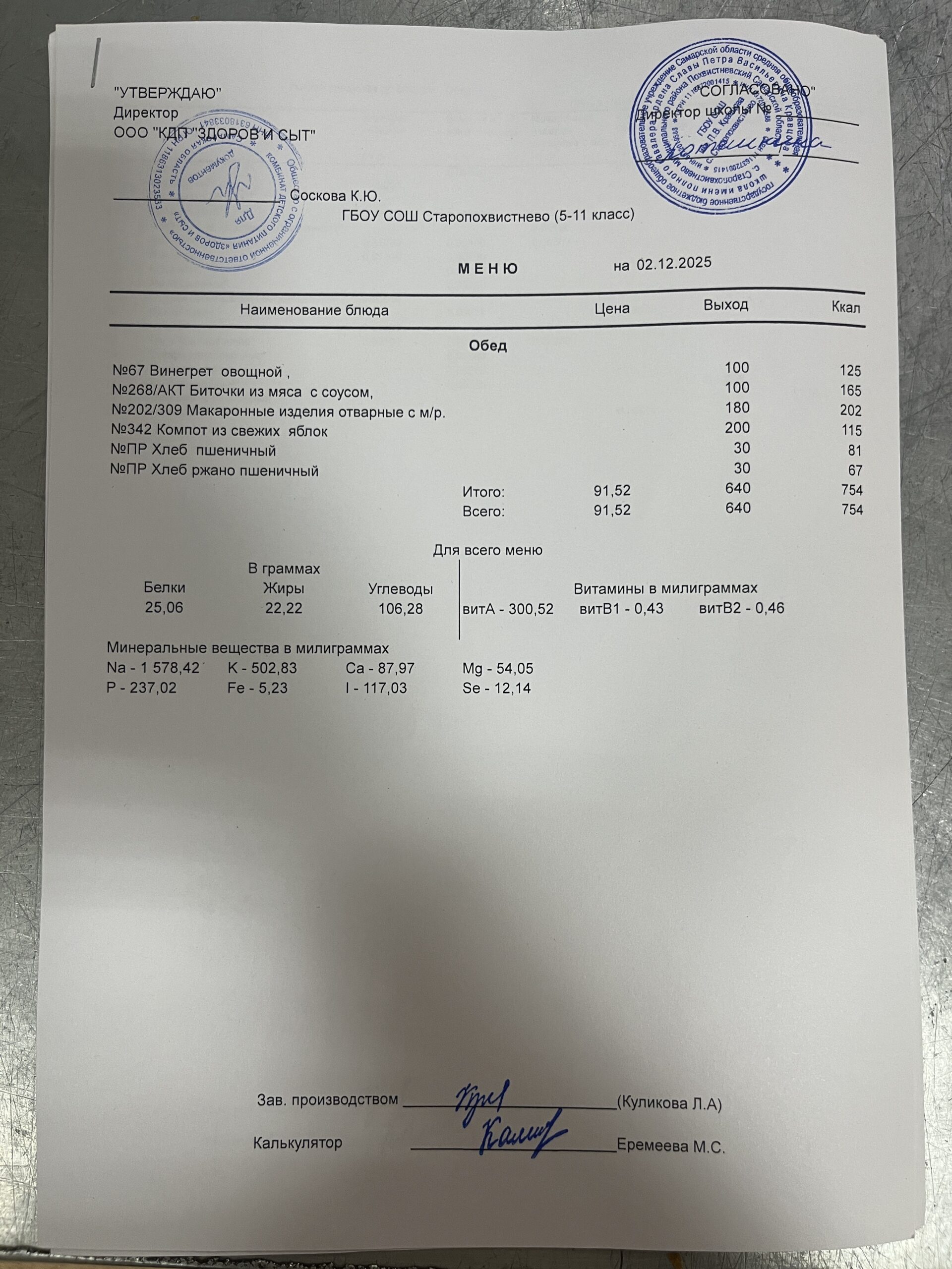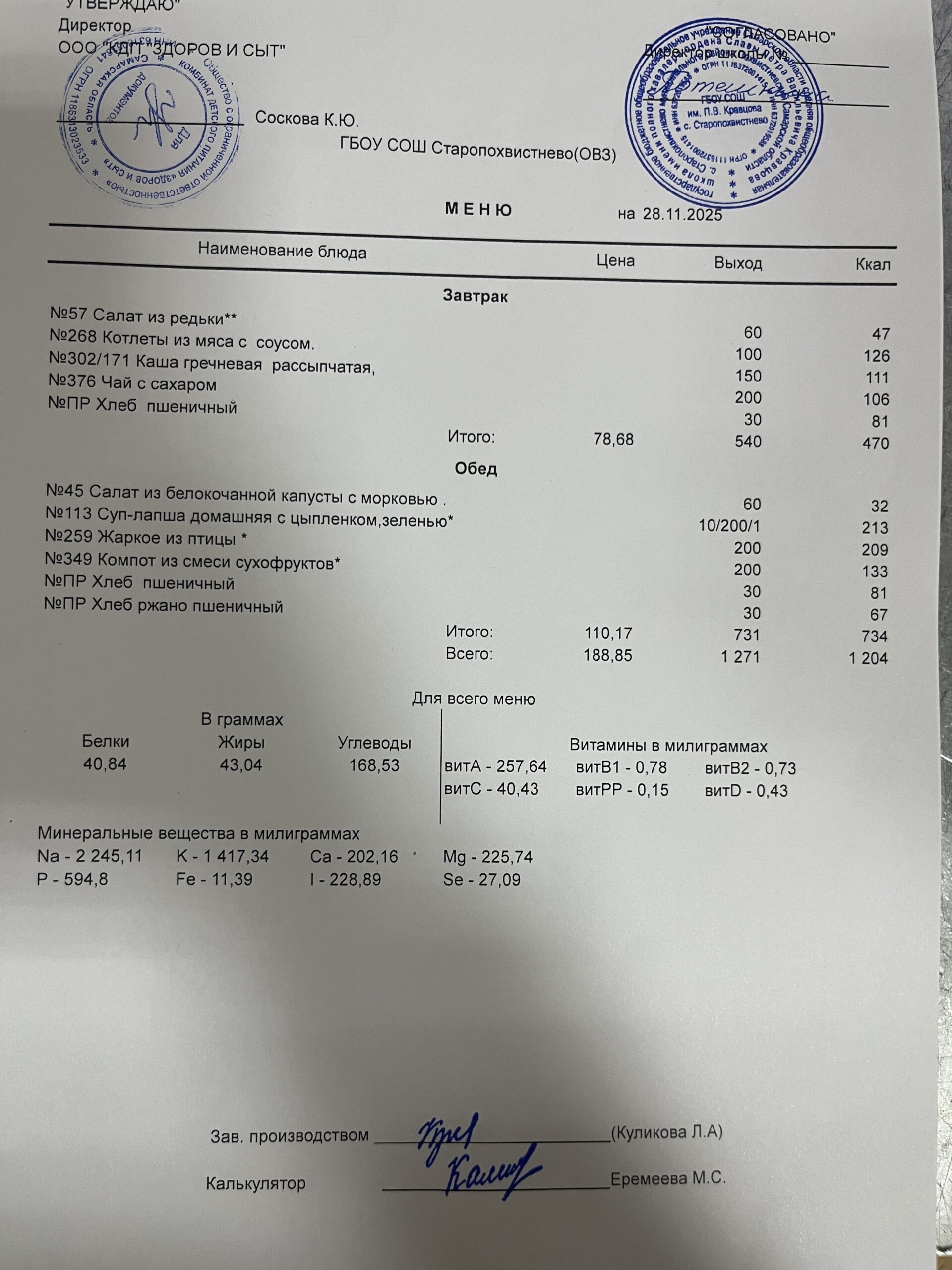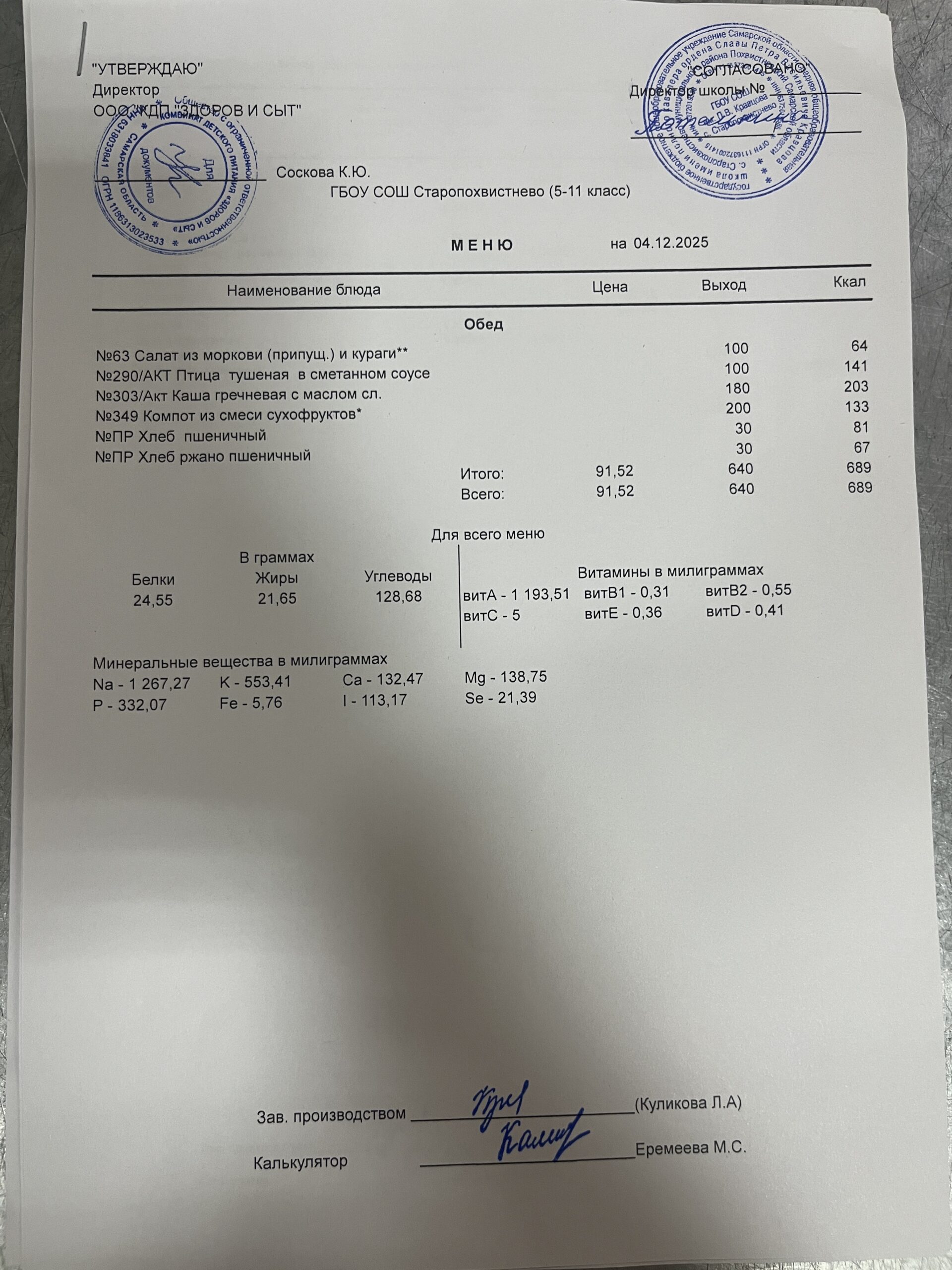 Утвержденное примерное меню (по сезонам в соответствии с возрастной категорией обучающихся)