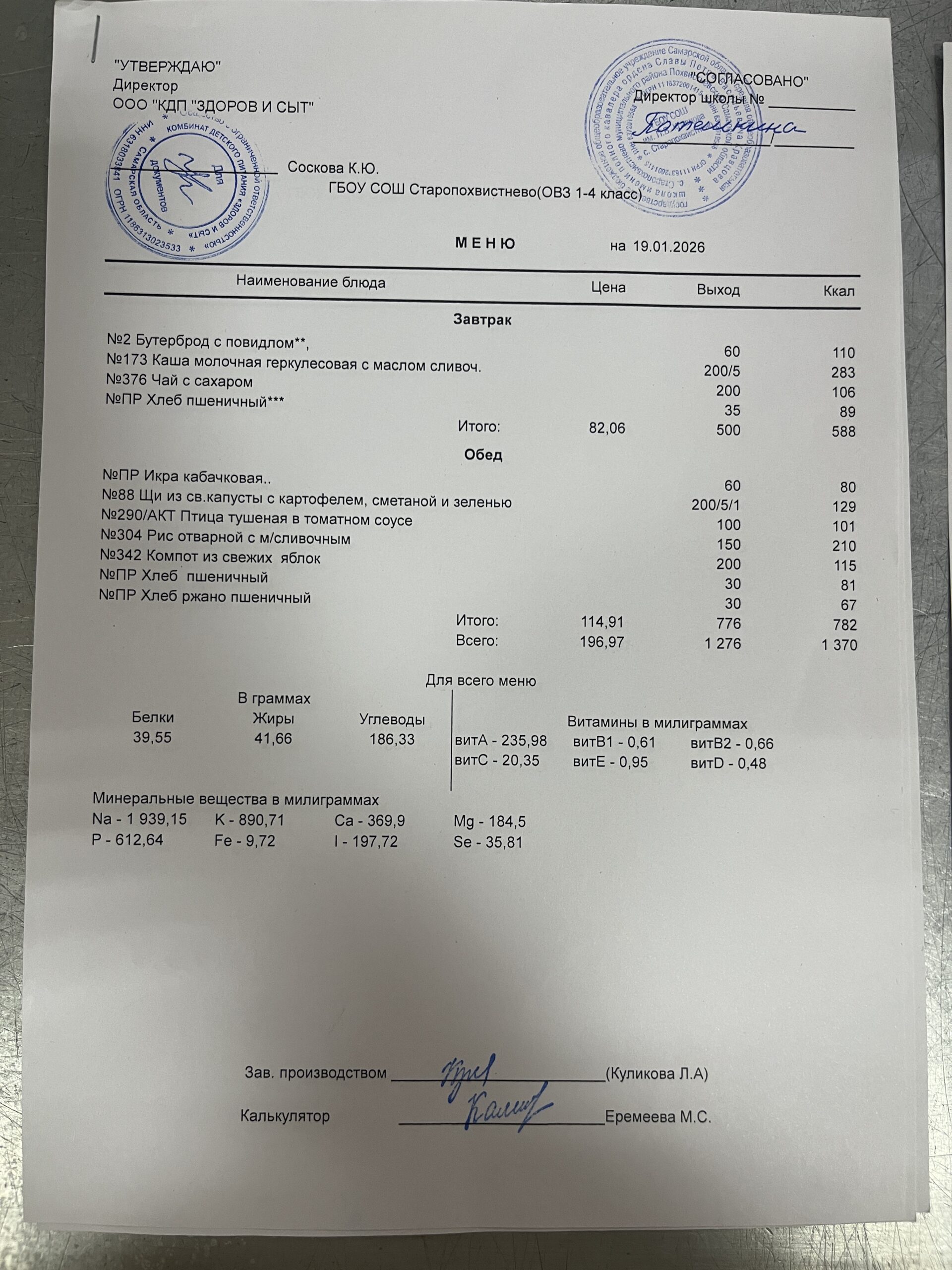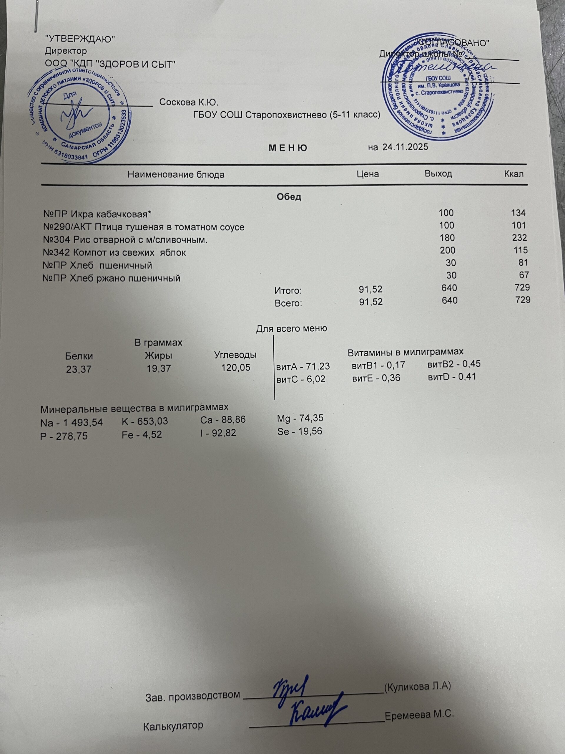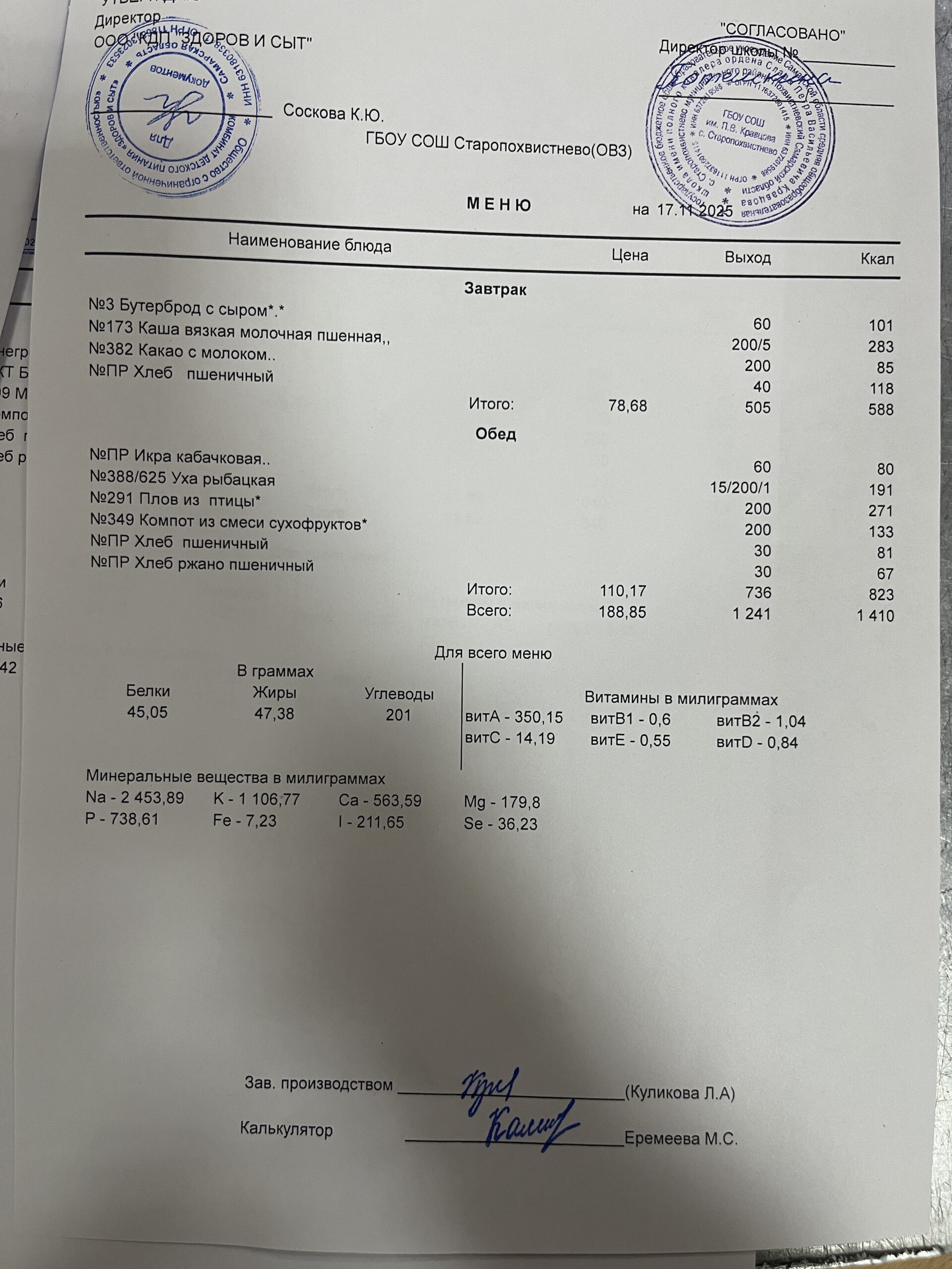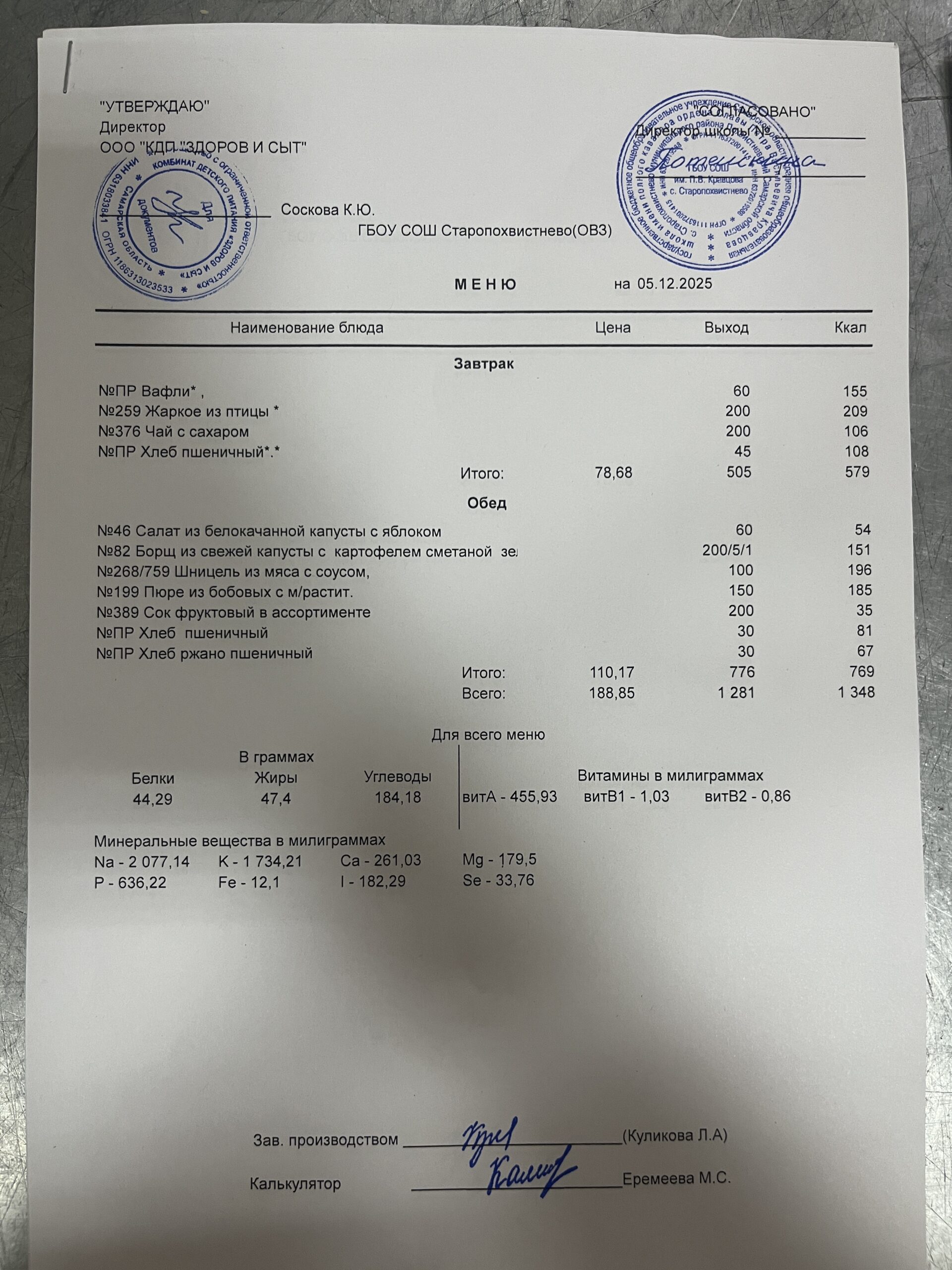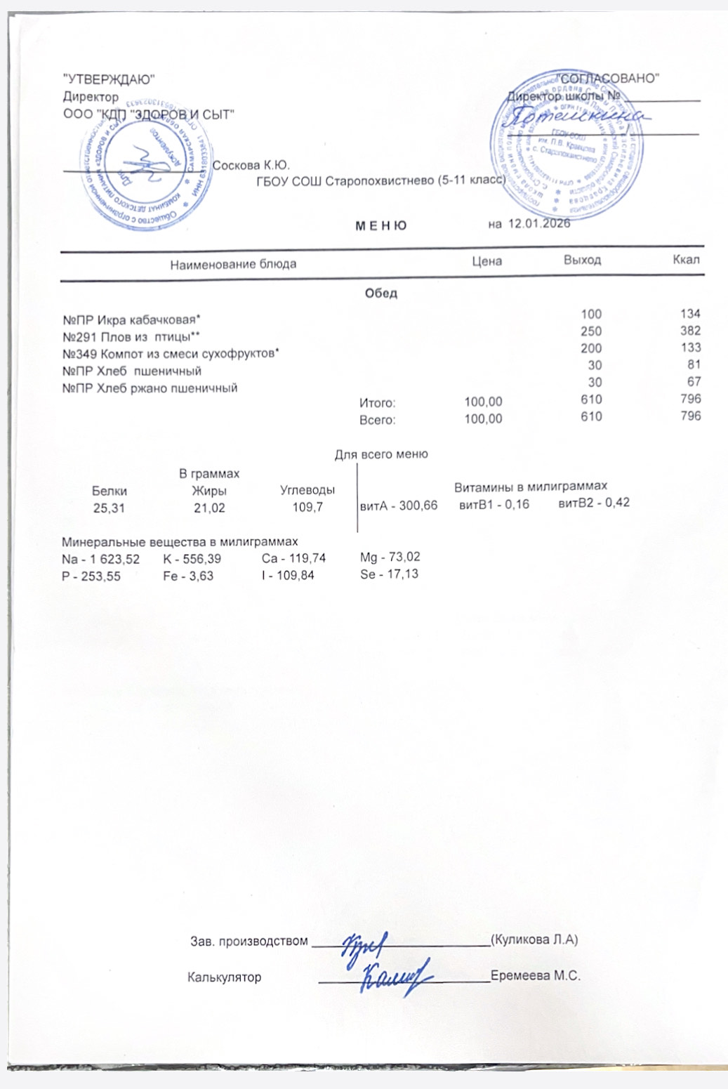 Утвержденное примерное меню (по сезонам в соответствии с возрастной категорией обучающихся)