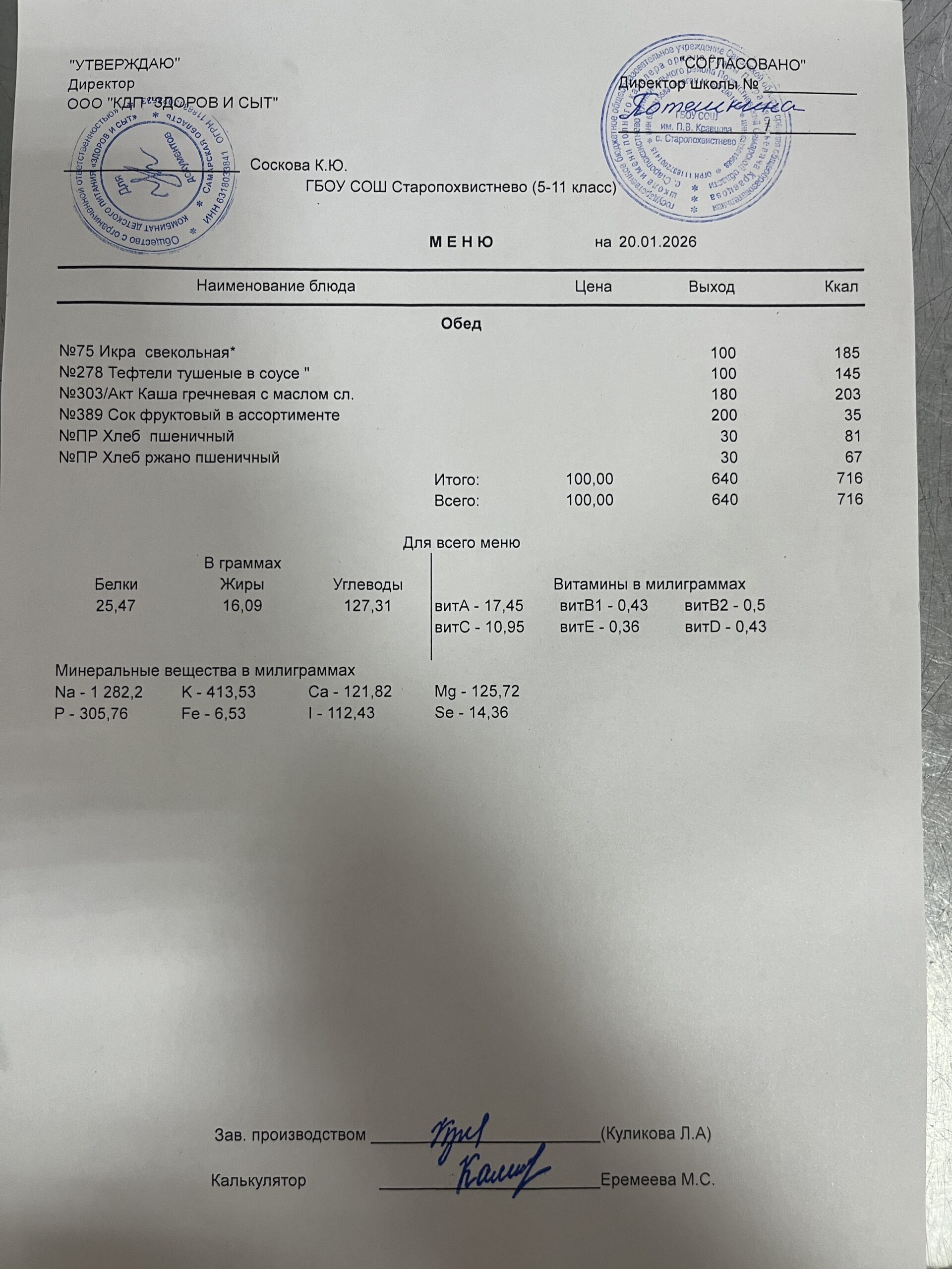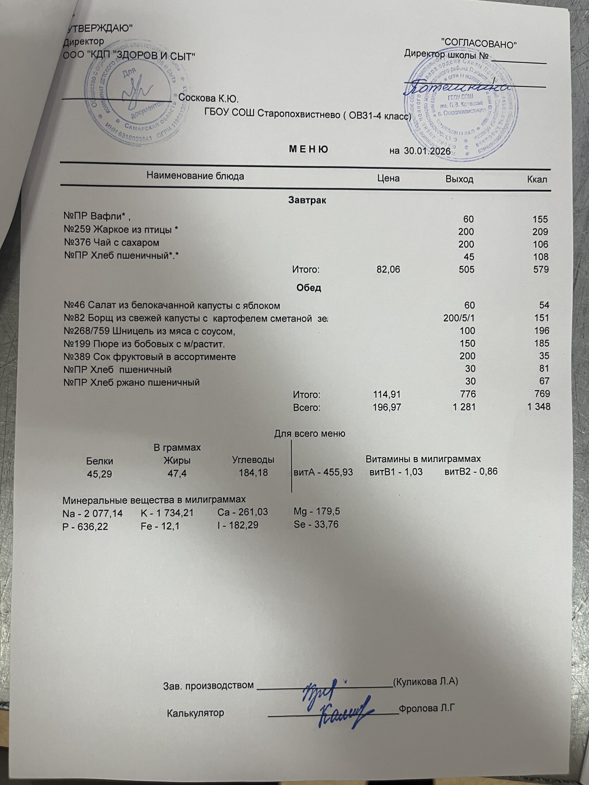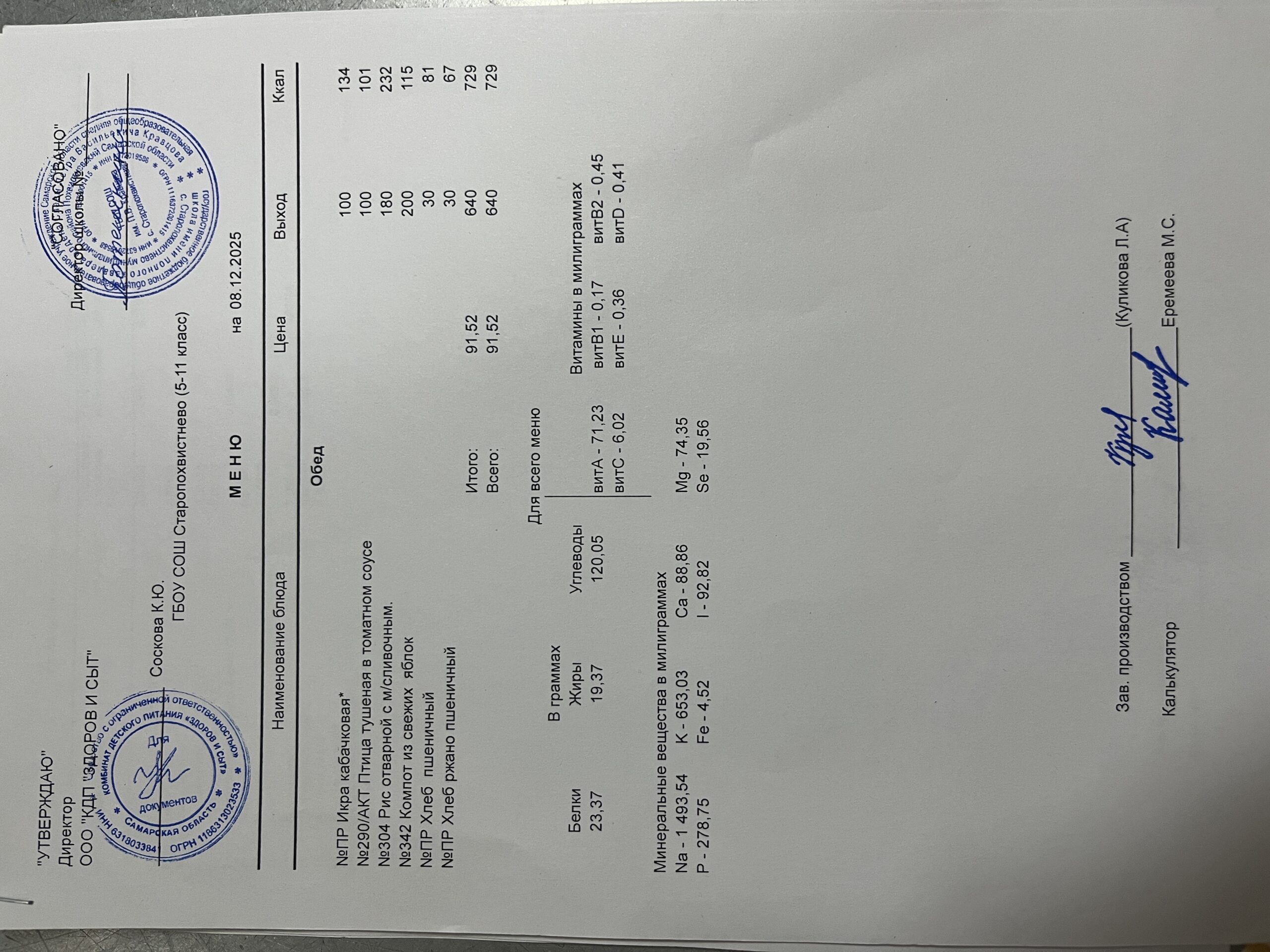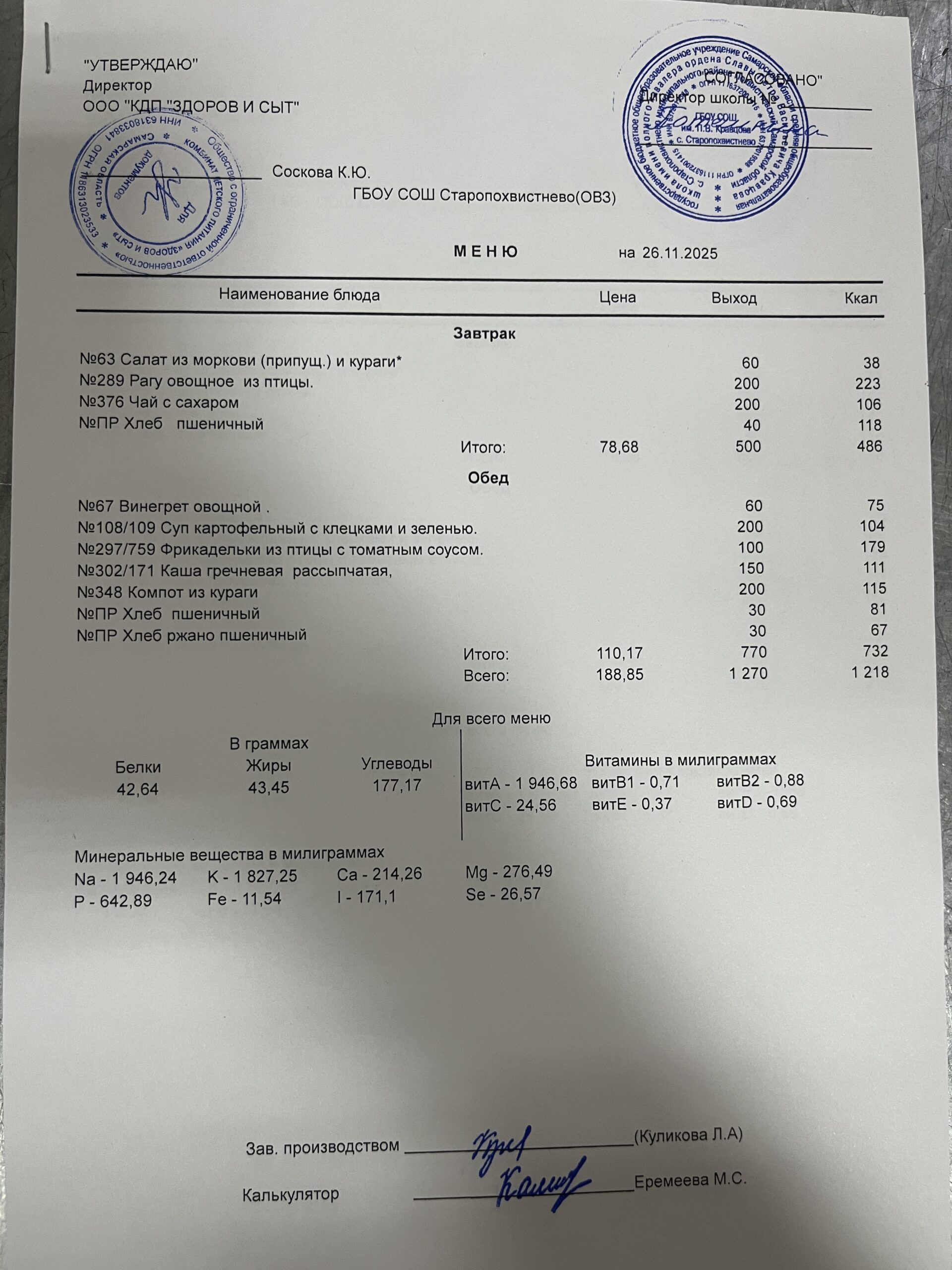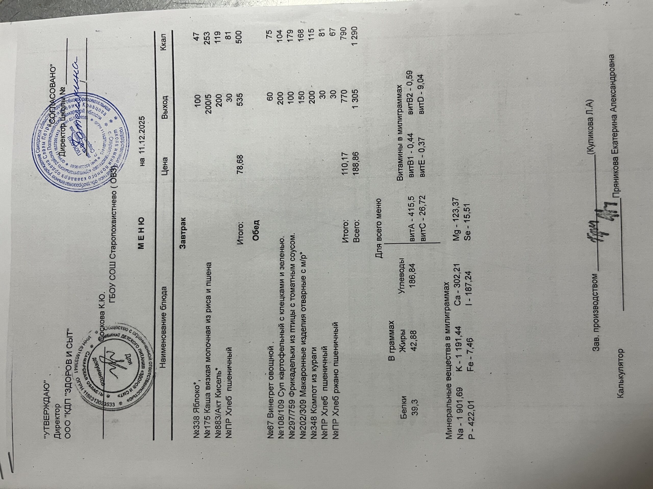 Утвержденное примерное меню (по сезонам в соответствии с возрастной категорией обучающихся)