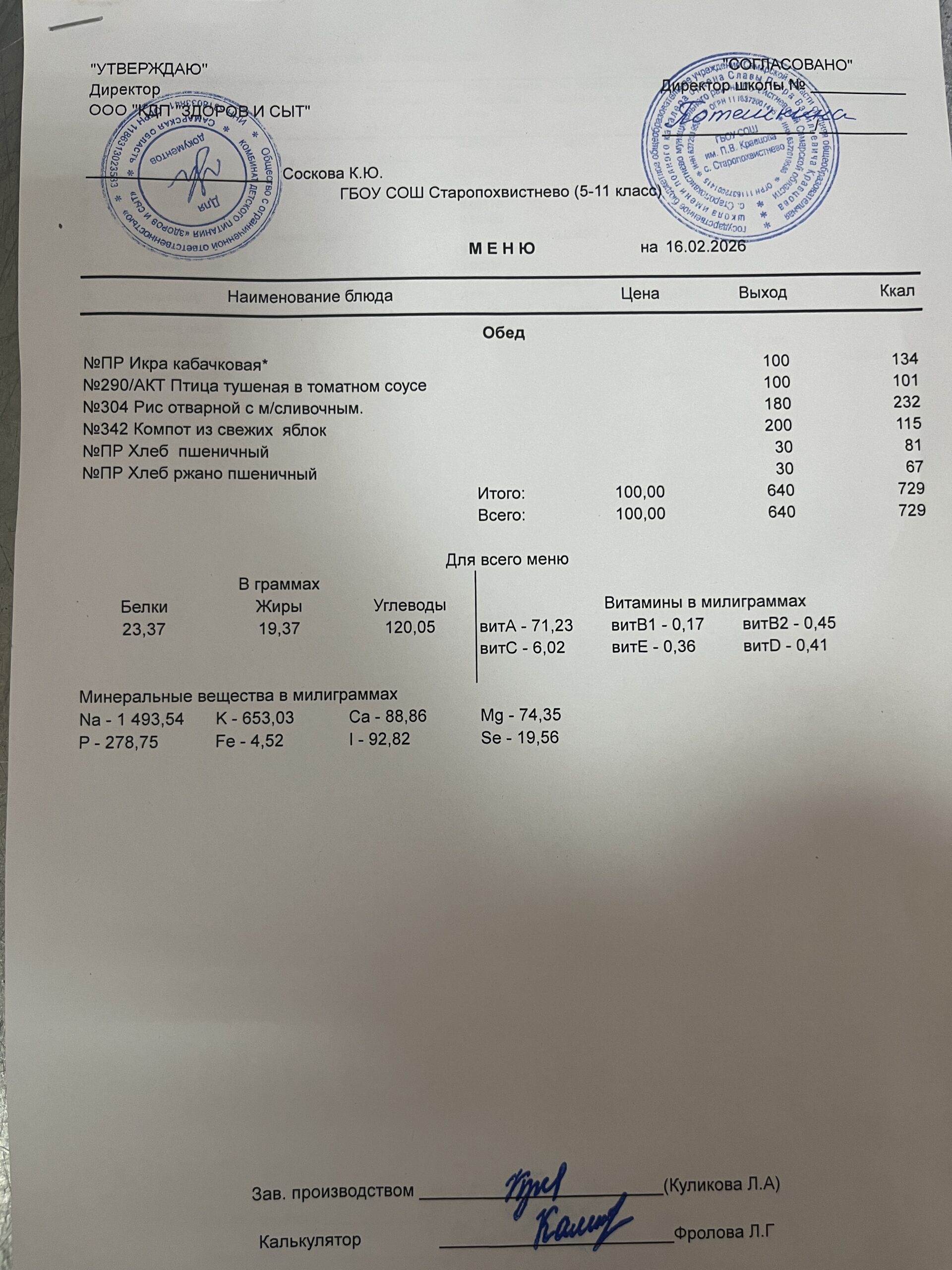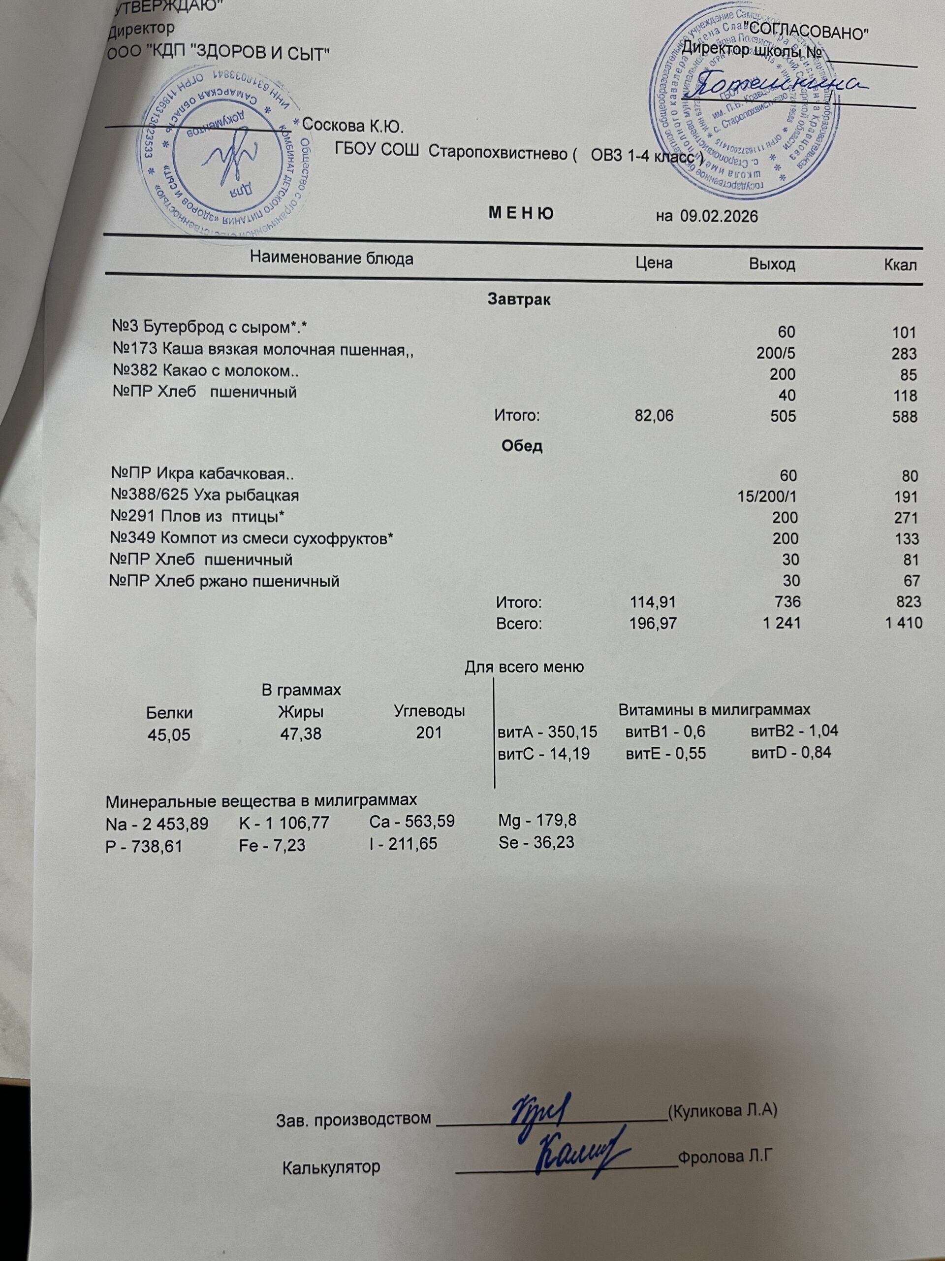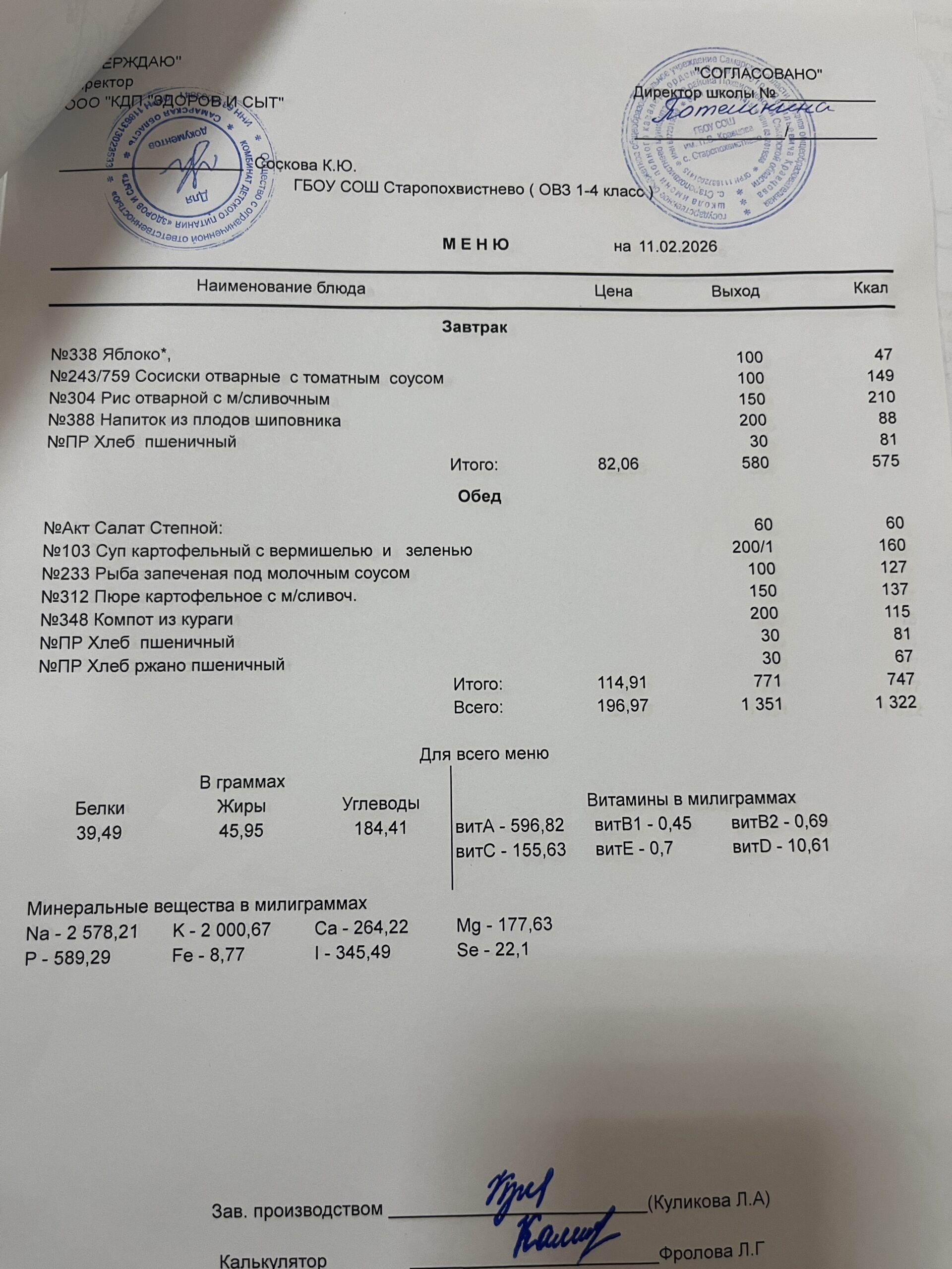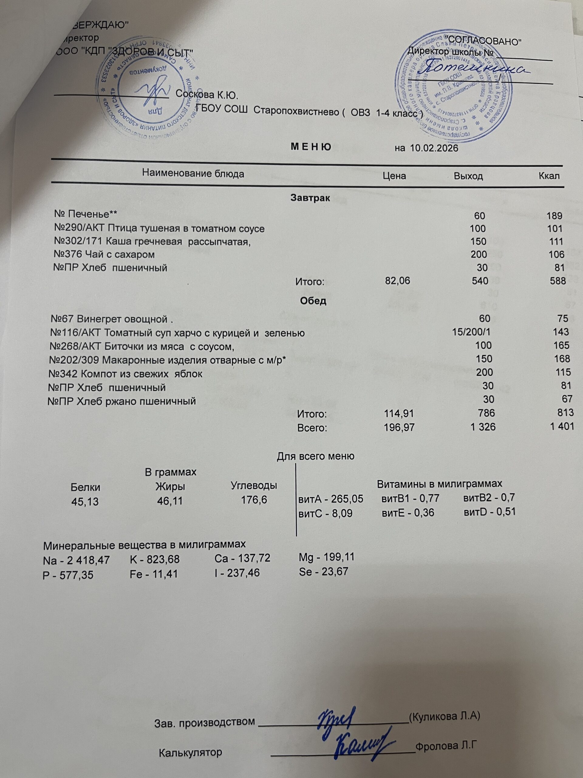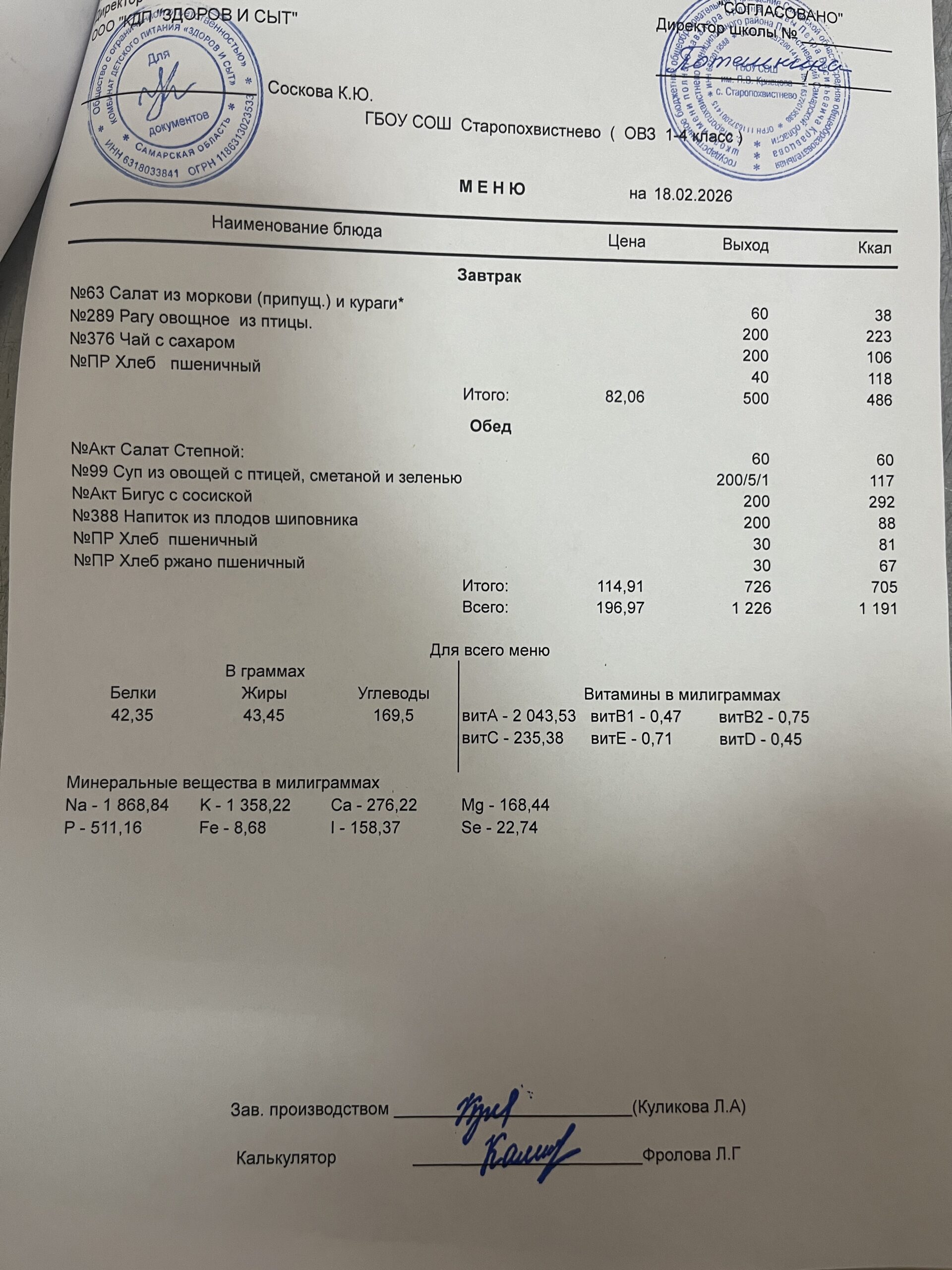 СВО старшие — 228,02(в т.ч. витаминизация 19,81 руб. 3 раза в неделю);
